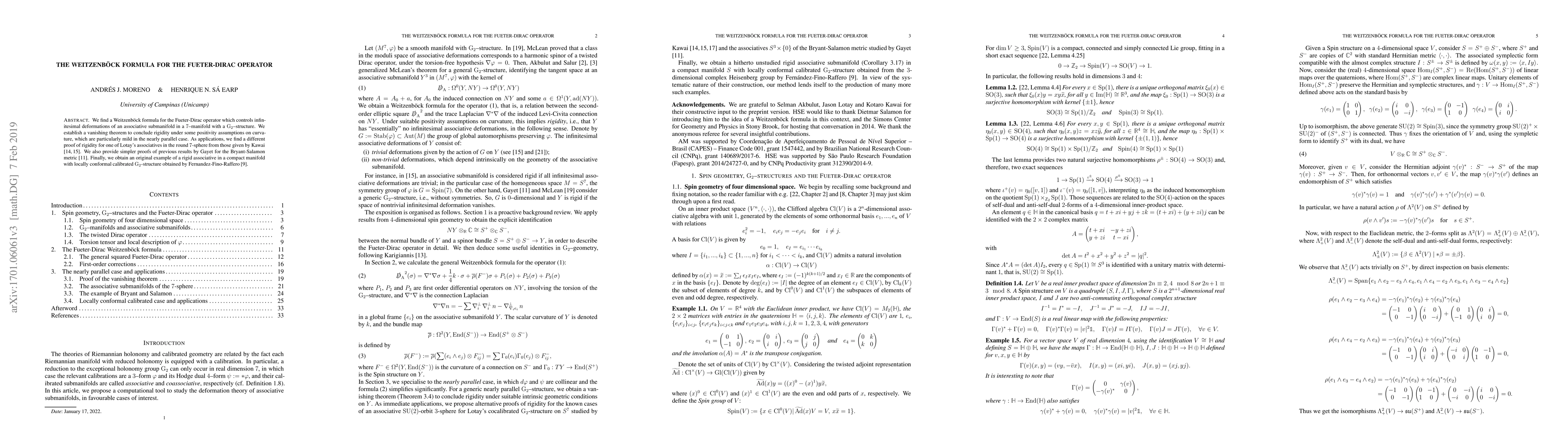 We find Weitzenb\"ock formula for the Fueter-Dirac operator which controls the infinitesimal deformations of an associative submanifold in a $7$--manifold with a $G_2$--structure. We establish a vanishing theorem to conclude rigidity under some positivity assumptions on curvature, which are particularly mild in the nearly parallel case. As applications, we give a different proof of rigidity for one of Lotay's associatives in the round $7$-sphere from those given by Kawai. We also provide simpler proofs of previous results by Gayet for the Bryant-Salamon metric. Finally, we obtain an original example of a rigid associative in a compact manifold with locally conformal calibrated $G_2$-structure obtained by Fernandez-Fino-Raffero.