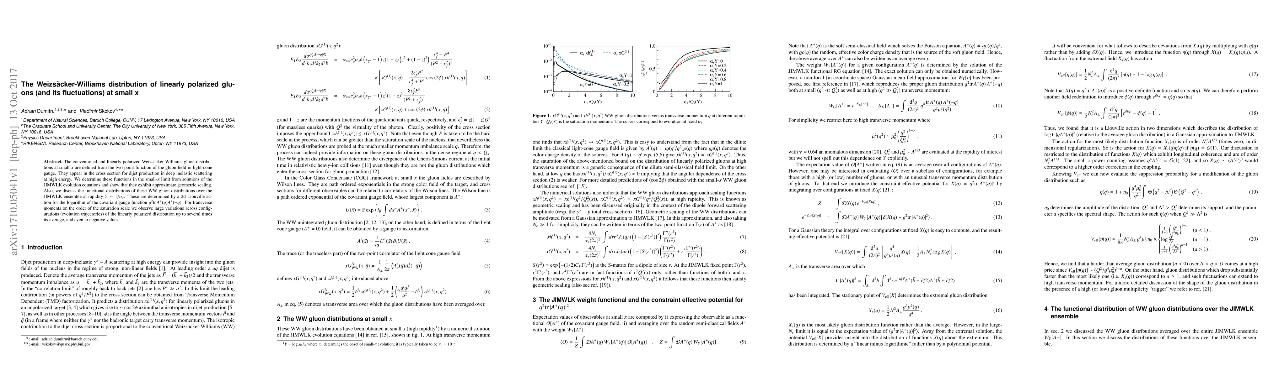 The conventional and linearly polarized Weizs\"acker-Williams gluon distributions at small x are defined from the two-point function of the gluon field in light-cone gauge. They appear in the cross section for dijet production in deep inelastic scattering at high energy. We determine these functions in the small-x limit from solutions of the JIMWLK evolution equations and show that they exhibit approximate geometric scaling. Also, we discuss the functional distributions of these WW gluon distributions over the JIMWLK ensemble at rapidity $Y\sim 1/\alpha_s$. These are determined by a 2d Liouville action for the logarithm of the covariant gauge function $g^2 \mathrm{tr}\,A^+(q)A^+(-q)$. For transverse momenta on the order of the saturation scale we observe large variations across configurations (evolution trajectories) of the linearly polarized distribution up to several times its average, and even to negative values.