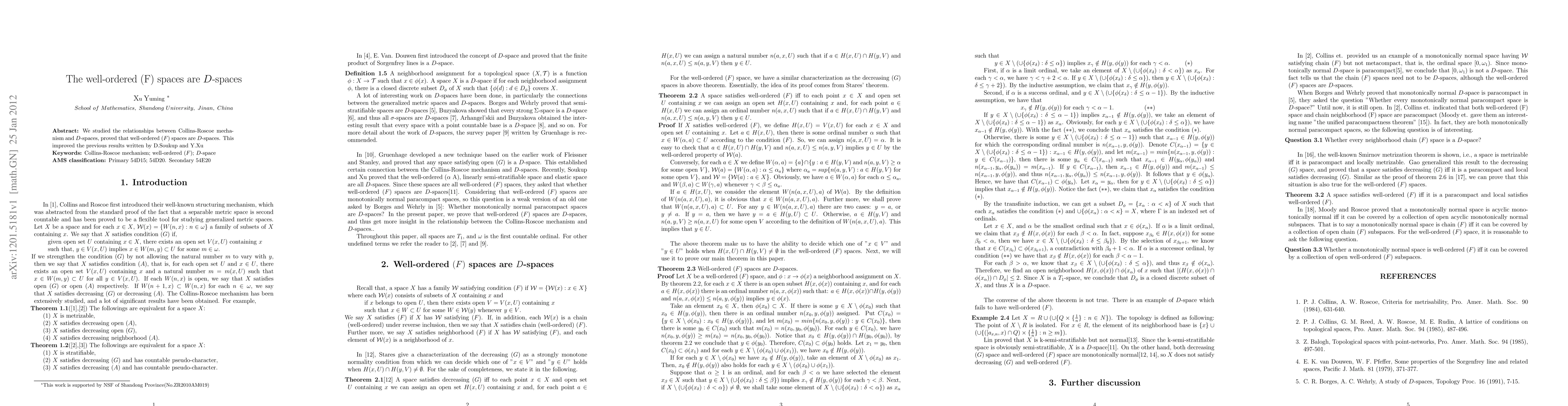 The paper proves that well-ordered (F) spaces are D-spaces, resolving a question previously posed by D.Soukup and Y.Xu. This was achieved by examining the relationships between Collins-Roscoe mechanism and D-spaces.