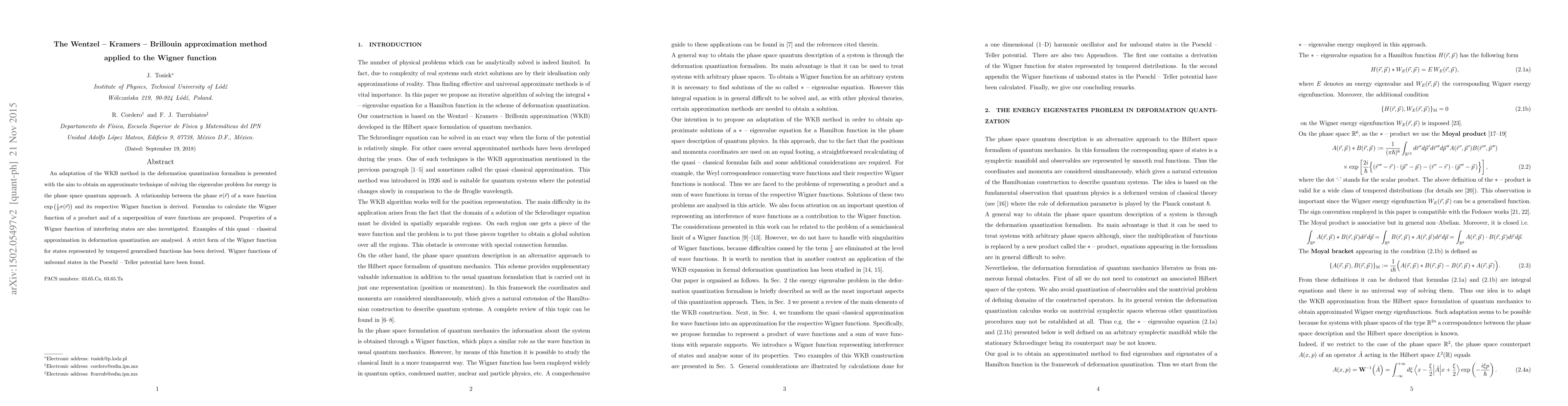 An adaptation of the WKB method in the deformation quantization formalism is presented with the aim to obtain an approximate technique of solving the eigenvalue problem for energy in the phase space quantum approach. A relationship between the phase $\sigma(\vec{r})$ of a wave function $\exp \left(\frac{i}{\hbar} \sigma(\vec{r}) \right)$ and its respective Wigner function is derived. Formulas to calculate the Wigner function of a product and of a superposition of wave functions are proposed. Properties of a Wigner function of interfering states are also investigated. Examples of this quasi - classical approximation in deformation quantization are analysed. A strict form of the Wigner function for states represented by tempered generalised functions has been derived. Wigner functions of unbound states in the Poeschl - Teller potential have been found.