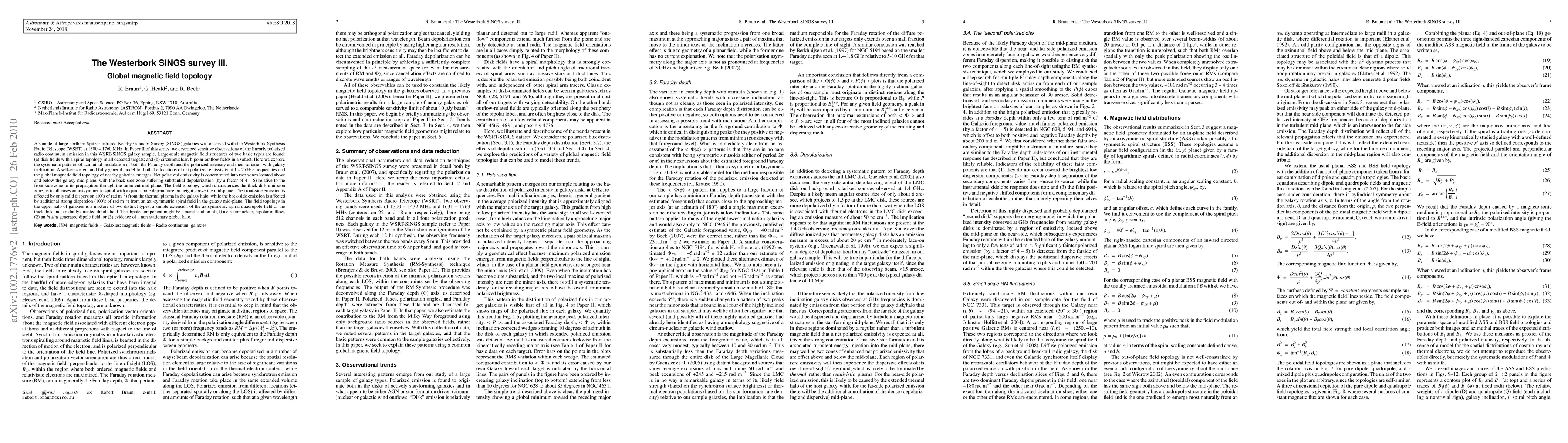 A sample of large northern Spitzer Infrared Nearby Galaxies Survey (SINGS) galaxies was recently observed with the Westerbork Synthesis Radio Telescope (WSRT) at 1300-1760 MHz. In Paper II of this series, we described sensitive observations of the linearly polarized radio continuum emission in this WSRT-SINGS galaxy sample. Here we explore the systematic patterns of azimuthal modulation of both the Faraday depth and the polarized intensity and their variation with galaxy inclination. A self-consistent and fully general model for both the locations of net polarized emissivity at 1-2 GHz frequencies and the global magnetic field topology of nearby galaxies emerges. Net polarized emissivity is concentrated into two zones located above and below the galaxy mid-plane, with the back-side zone suffering substantial depolarization (by a factor of 4-5) relative to the front-side zone in its propagation through the turbulent mid-plane. The field topology, which characterizes the thick-disk emission zone is in all cases an axisymmetric spiral with a quadrupole dependence on height above the mid-plane. The front-side emission is affected by only mild dispersion (10's of rad/m2) from the thermal plasma in the galaxy halo, while the back-side emission is affected by additional strong dispersion (100's of rad/m2) from an axisymmetric spiral field in the galaxy mid-plane. The field topology in the upper halo of galaxies is a mix of two distinct types: a simple extension of the axisymmetric spiral quadrupole field of the thick disk and a radially directed dipole field. The dipole component might be a manifestation of (1) a circumnuclear, bipolar outflow, (2) an in situ generated dipole field, or (3) evidence of a non-stationary global halo.