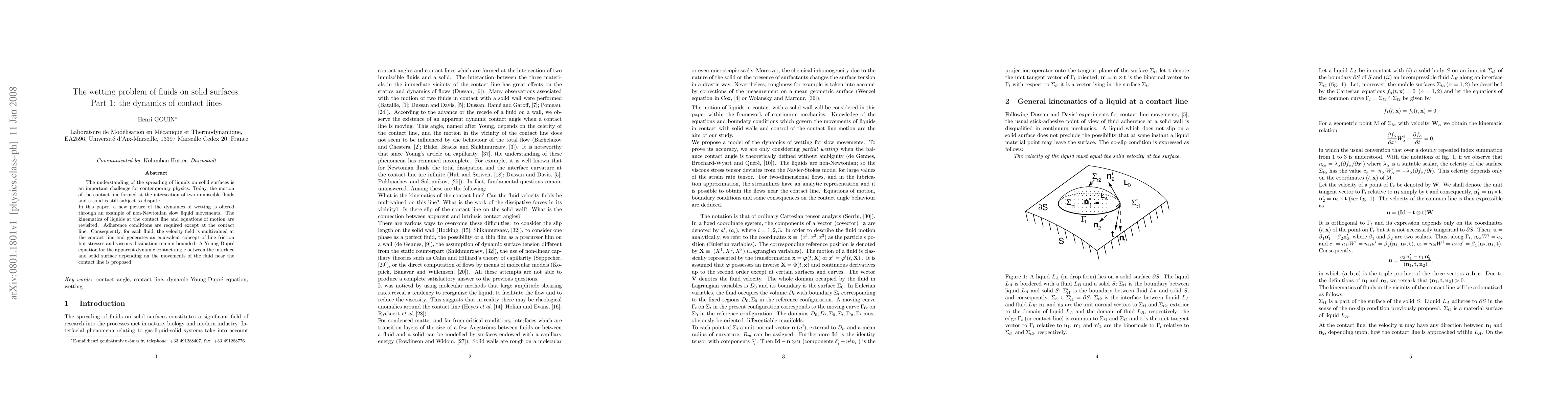 The understanding of the spreading of liquids on solid surfaces is an important challenge for contemporary physics. Today, the motion of the contact line formed at the intersection of two immiscible fluids and a solid is still subject to dispute. In this paper, a new picture of the dynamics of wetting is offered through an example of non-Newtonian slow liquid movements. The kinematics of liquids at the contact line and equations of motion are revisited. Adherence conditions are required except at the contact line. Consequently, for each fluid, the velocity field is multivalued at the contact line and generates an equivalent concept of line friction but stresses and viscous dissipation remain bounded. A Young-Dupr\'e equation for the apparent dynamic contact angle between the interface and solid surface depending on the movements of the fluid near the contact line is proposed.