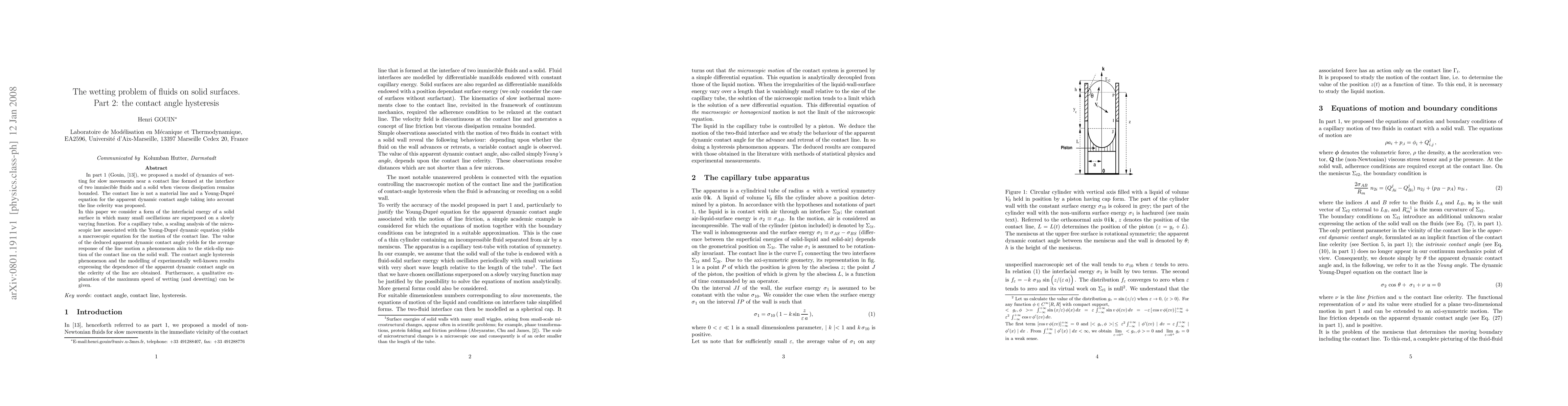 In part 1, we proposed a model of dynamics of wetting for slow movements near a contact line formed at the interface of two immiscible fluids and a solid when viscous dissipation remains bounded. The contact line is not a material line and a Young-Dupr\'e equation for the apparent dynamic contact angle taking into account the line celerity was proposed. In this paper we consider a form of the interfacial energy of a solid surface in which many small oscillations are superposed on a slowly varying function. For a capillary tube, a scaling analysis of the microscopic law associated with the Young-Dupr\'e dynamic equation yields a macroscopic equation for the motion of the contact line. The value of the deduced apparent dynamic contact angle yields for the average response of the line motion a phenomenon akin to the stick-slip motion of the contact line on the solid wall. The contact angle hysteresis phenomenon and the modelling of experimentally well-known results expressing the dependence of the apparent dynamic contact angle on the celerity of the line are obtained. Furthermore, a qualitative explanation of the maximum speed of wetting (and dewetting) can be given.