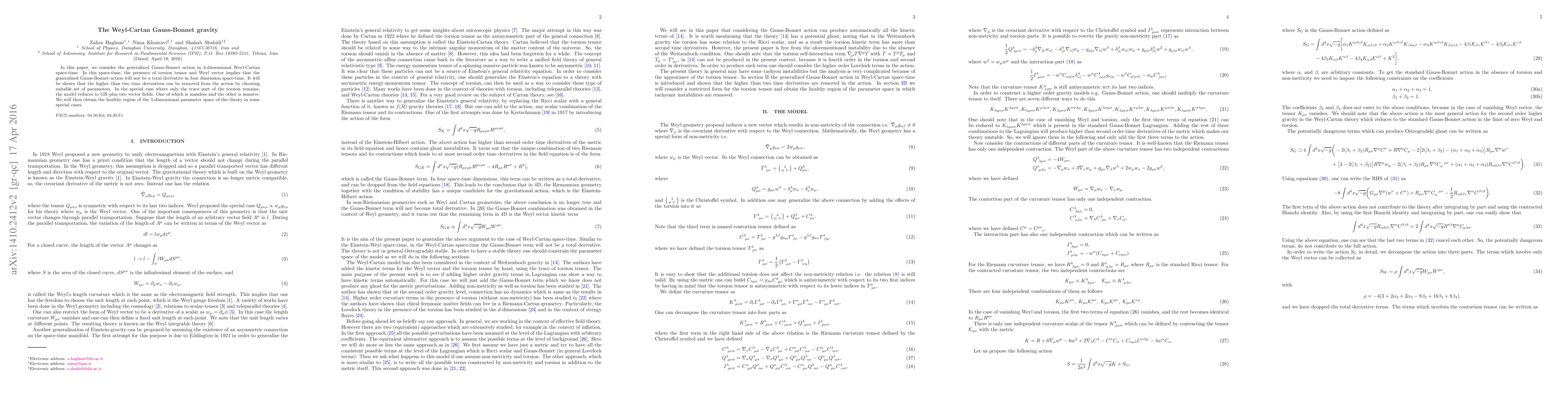 In this paper, we consider the generalized Gauss-Bonnet action in $4$-dimensional Weyl-Cartan space-time. In this space-time, the presence of torsion tensor and Weyl vector implies that the generalized Gauss-Bonnet action will not be a total derivative in four dimension space-time. It will be shown that the higher than two time derivatives can be removed from the action by choosing suitable set of parameters. In the special case where only the trace part of the torsion remains, the model reduces to GR plus two vector fields. One of which is massless and the other is massive. We will then obtain the healthy region of the 5-dimensional parameter space of the theory in some special cases.