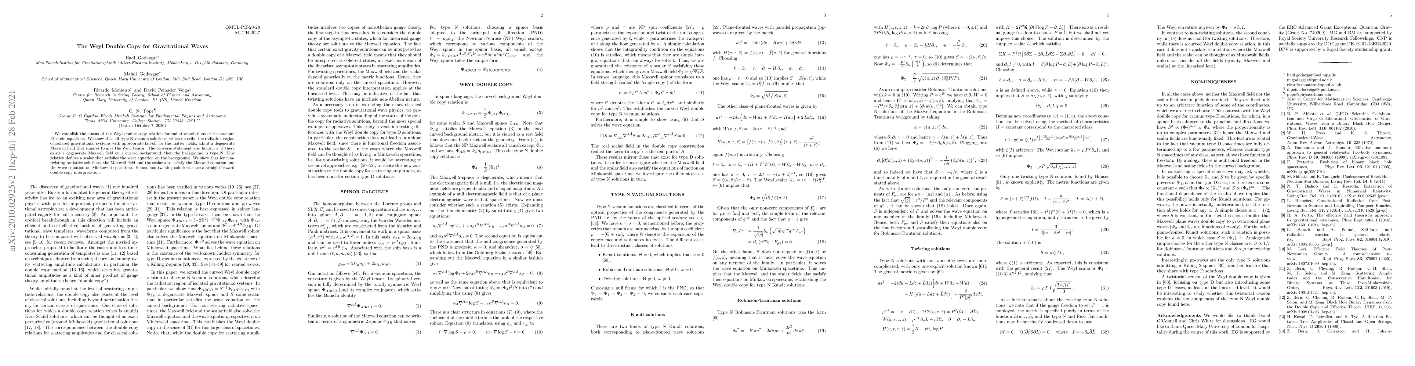 This paper establishes the Weyl double copy relation for gravitational waves, showing that type N vacuum solutions of the Einstein equations have a degenerate Maxwell field that squares to the Weyl tensor, and conversely, if such a Maxwell field exists, the background is type N. Non-twisting radiative solutions exhibit a direct double copy interpretation.