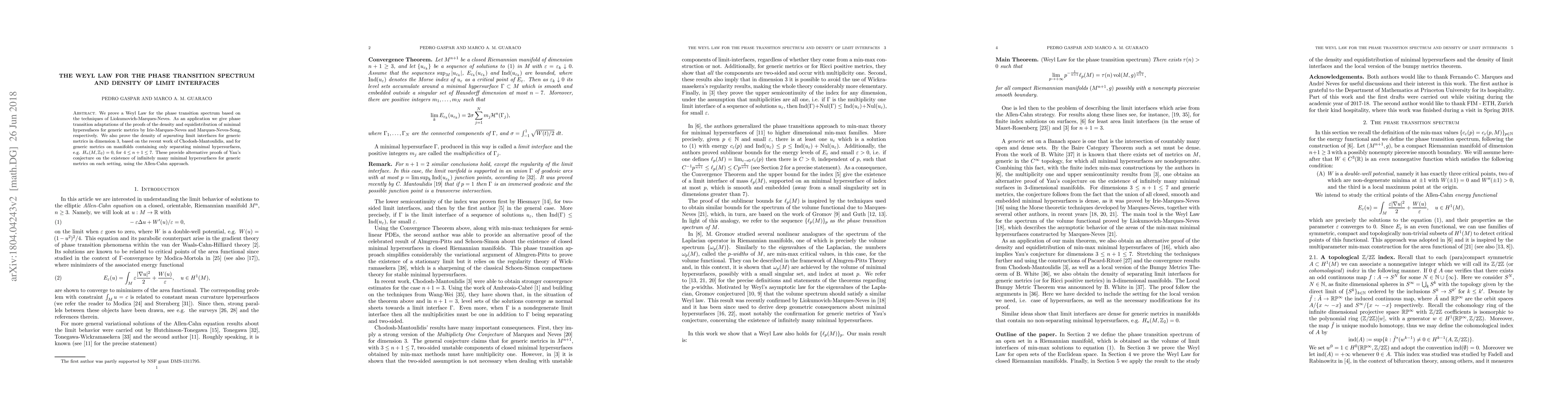 Researchers prove a Weyl Law for phase transition spectra in certain geometric settings, providing new insights into the existence of minimal hypersurfaces and separating limit interfaces under generic metrics.