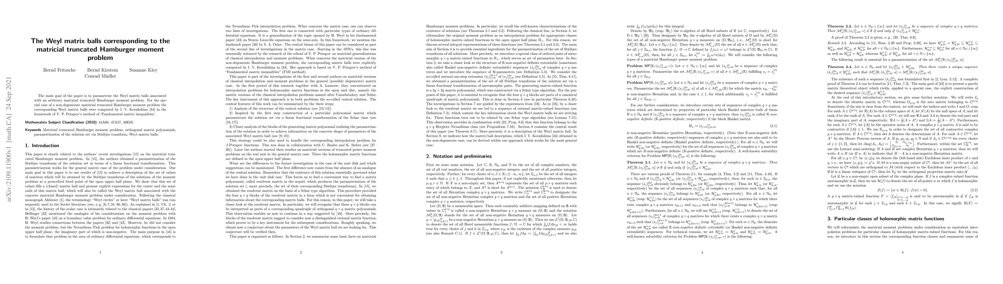 The main goal of the paper is to parametrize the Weyl matrix balls associated with an arbitrary matricial truncated Hamburger moment problem. For the special case of a non-degenerate matricial truncated Hamburger moment problem the corresponding Weyl matrix balls were computed by I. V. Kovalishina in the framework of V. P. Potapov's method of "Fundamental matrix inequalities".