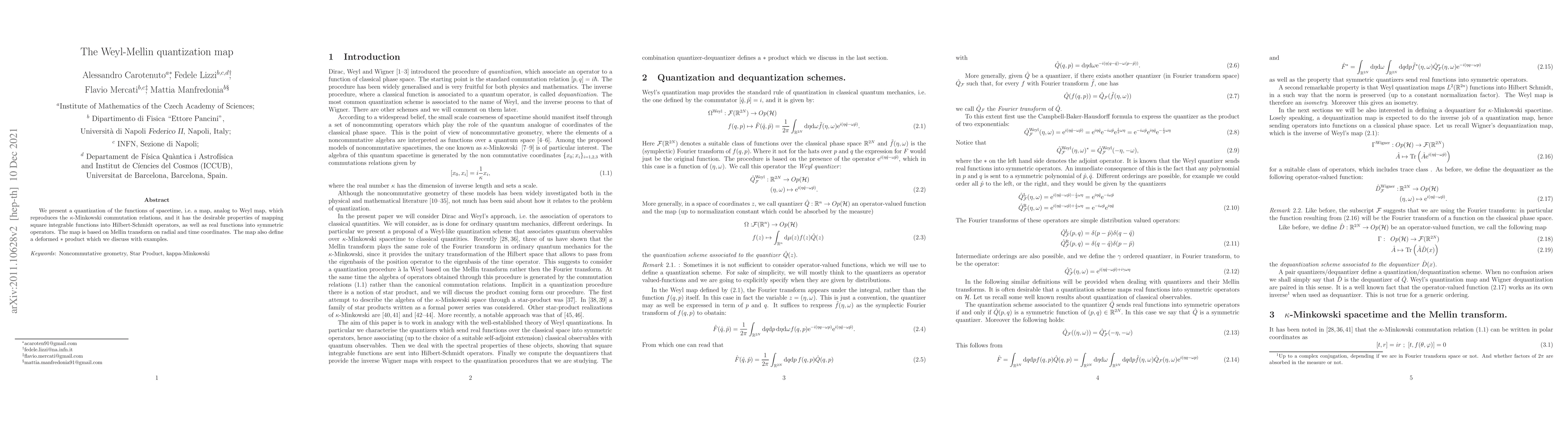 We present a quantization of the functions of spacetime, i.e.\ a map, analog to Weyl map, which reproduces the $\kappa$-Minkowski commutation relations, and it has the desirable properties of mapping square integrable funcions into Hilbert-Schmidt operators, as well as real functions into self-adjoint operators. The map is based on Mellin transform on radial and time coordinates. The map also define a deformed $*$ product which we discuss with examples.
