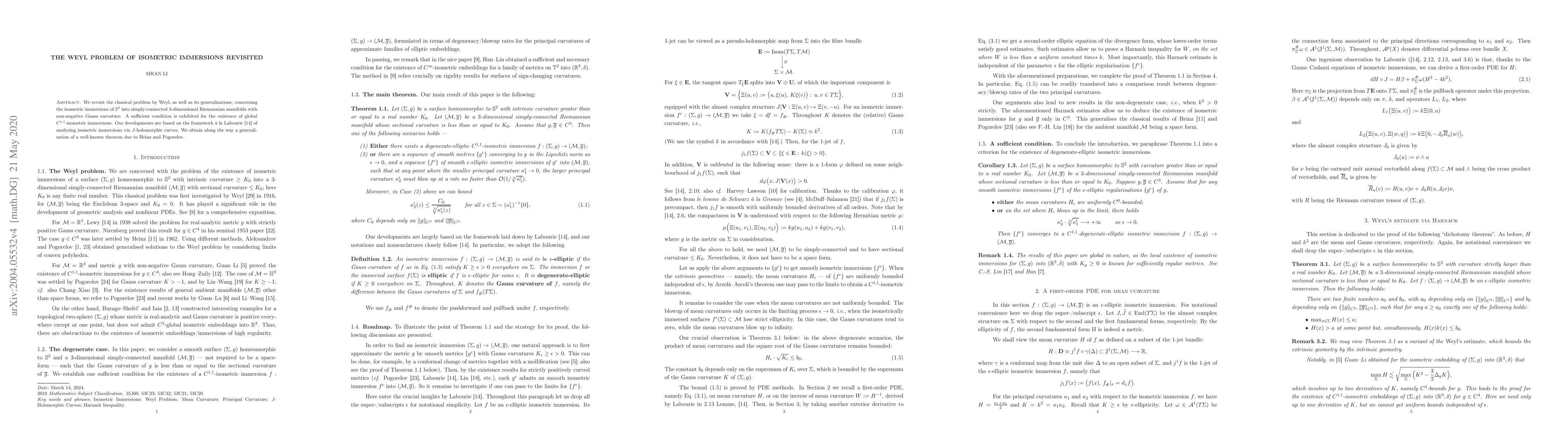 Summary: This paper revisits Weyl's classical problem on the isometric immersions of $\mathbb{S}^2$ into $3$-dimensional Riemannian manifolds with non-negative Gauss curvature, presenting a sufficient condition for global $C^{1,1}$-isometric immersions. The work builds on Labourie's framework using $J$-holomorphic curves and extends a theorem by Heinz and Pogorelov.