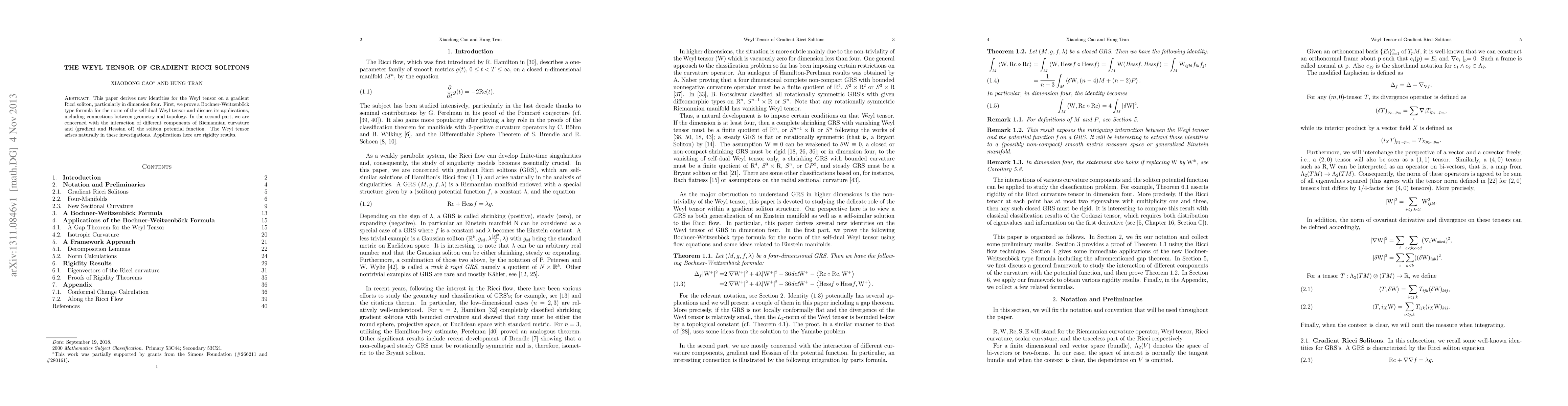 This paper derives new identities for the Weyl tensor on a gradient Ricci soliton, particularly in dimension four. First, we prove a Bochner-Weitzenb\"ock type formula for the norm of the self-dual Weyl tensor and discuss its applications, including connections between geometry and topology. In the second part, we are concerned with the interaction of different components of Riemannian curvature and (gradient and Hessian of) the soliton potential function. The Weyl tensor arises naturally in these investigations. Applications here are rigidity results.