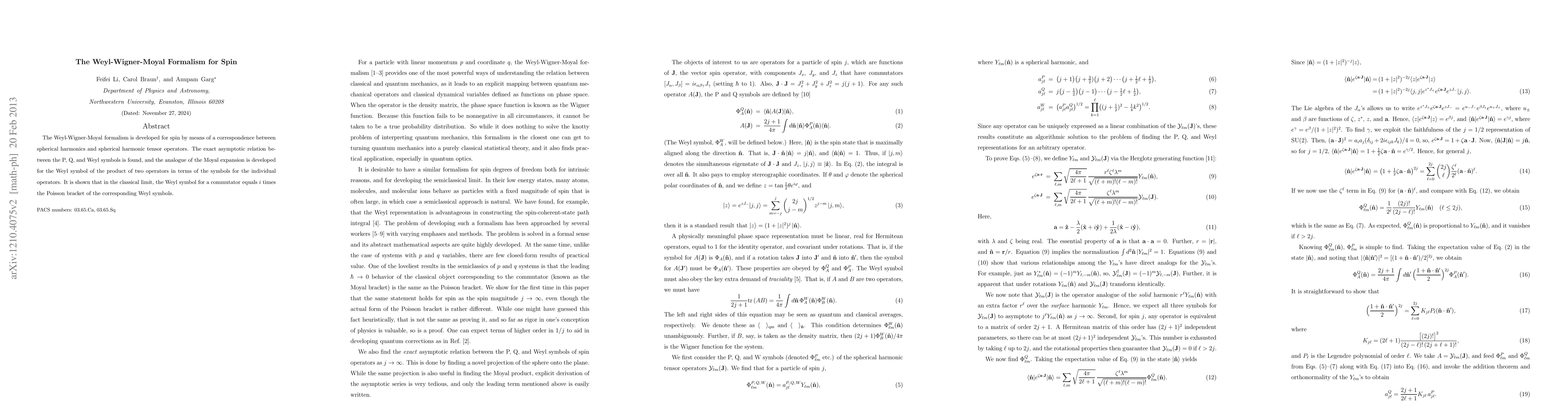 The Weyl-Wigner-Moyal formalism is extended to spin using spherical harmonics and tensor operators, and the Moyal expansion is adapted for operator products, showing that in the classical limit, the Weyl symbol for a commutator equals $i$ times the Poisson bracket, while the anticommutator has no correction at this order.
