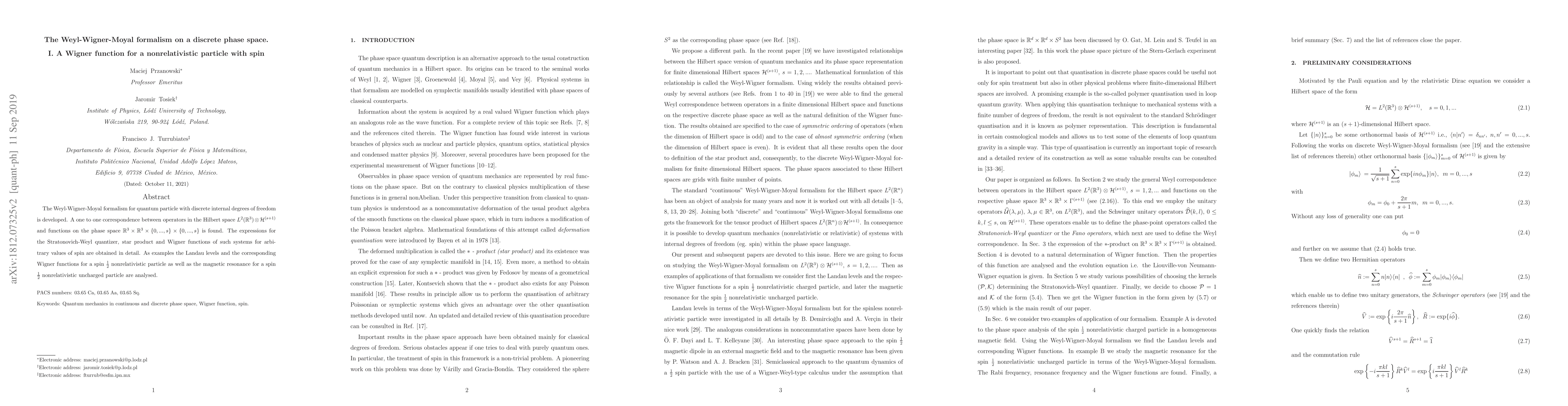 The paper develops the Weyl-Wigner-Moyal formalism for quantum particles with discrete spin states, establishing a one-to-one mapping between operators and phase space functions. It provides detailed expressions for the Stratonovich-Weyl quantizer, star product, and Wigner functions for particles of arbitrary spin, with examples including spin-½ particles in Landau levels and magnetic resonance.