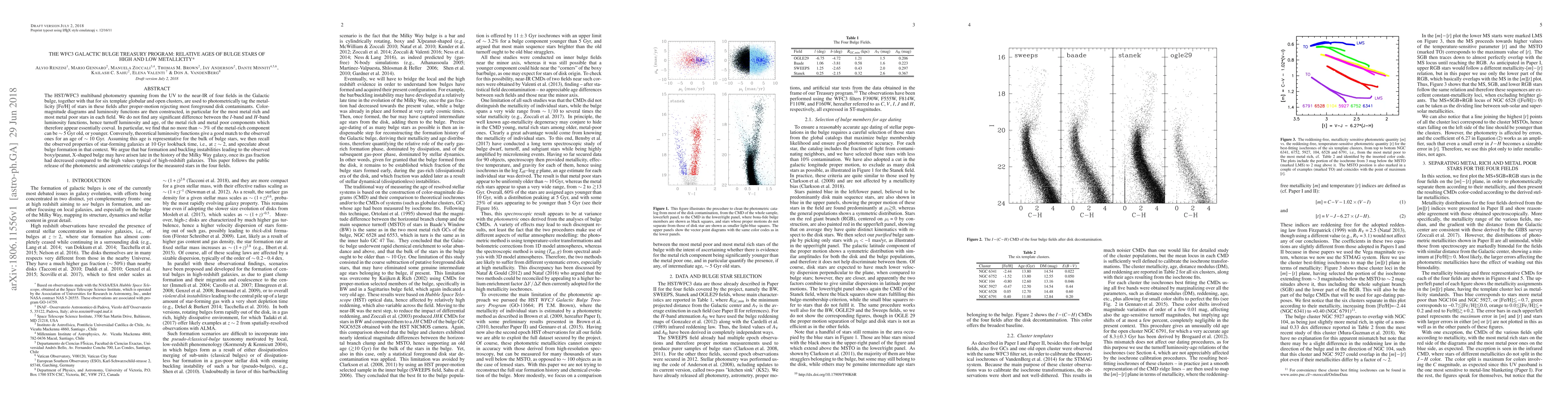 The HST/WFC3 multiband photometry spanning from the UV to the near-IR of four fields in the Galactic bulge, together with that for six template globular and open clusters, are used to photometrically tag the metallicity [Fe/H] of stars in these fields after proper-motion rejecting most foreground disk contaminants. Color-magnitude diagrams and luminosity functions are then constructed, in particular for the most metal rich and most metal poor stars in each field. We do not find any significant difference between the $I$-band and $H$-band luminosity functions, hence turnoff luminosity and age, of the metal rich and metal poor components which therefore appear essentially coeval. In particular, we find that no more than $\sim 3\%$ of the metal-rich component can be $\sim 5$ Gyr old, or younger. Conversely, theoretical luminosity functions give a good match to the observed ones for an age of ~10 Gyr. Assuming this age is representative for the bulk of bulge stars, we then recall the observed properties of star-forming galaxies at 10 Gyr lookback time, i.e., at z~2, and speculate about bulge formation in that context. We argue that bar formation and buckling instabilities leading to the observed boxy/peanut, X-shaped bulge may have arisen late in the history of the Milky Way galaxy, once its gas fraction had decreased compared to the high values typical of high-redshift galaxies. This paper follows the public release of the photometric and astrometric catalogs for the measured stars in the four fields.