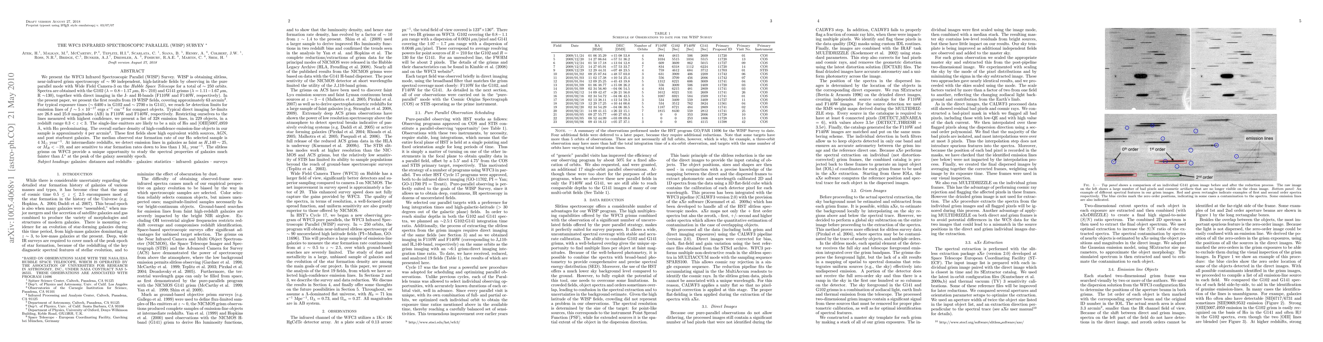 The WFC3 Infrared Spectroscopic Parallel (WISP) Survey utilizes the Hubble Space Telescope's Wide Field Camera-3 to obtain near-infrared grism spectroscopy of high-latitude fields, revealing emission lines in galaxies at redshifts 0.3 < z < 3. Initial results from 19 fields show a high surface density of emission-line objects, with star formation rates detectable down to less than 1 Msol/year.