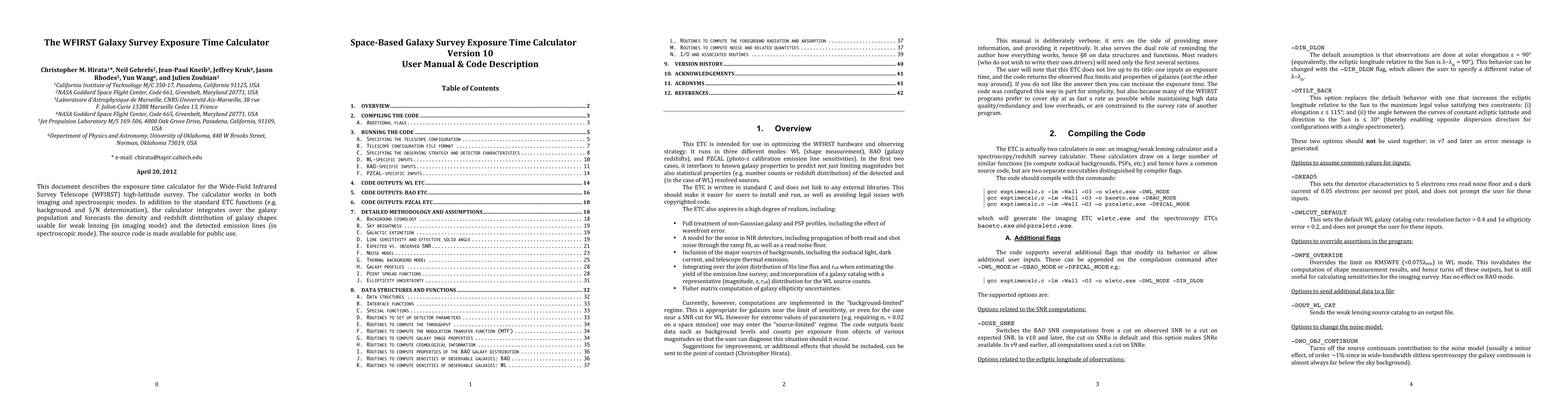 This document describes the exposure time calculator for the Wide-Field Infrared Survey Telescope (WFIRST) high-latitude survey. The calculator works in both imaging and spectroscopic modes. In addition to the standard ETC functions (e.g. background and S/N determination), the calculator integrates over the galaxy population and forecasts the density and redshift distribution of galaxy shapes usable for weak lensing (in imaging mode) and the detected emission lines (in spectroscopic mode). The source code is made available for public use.