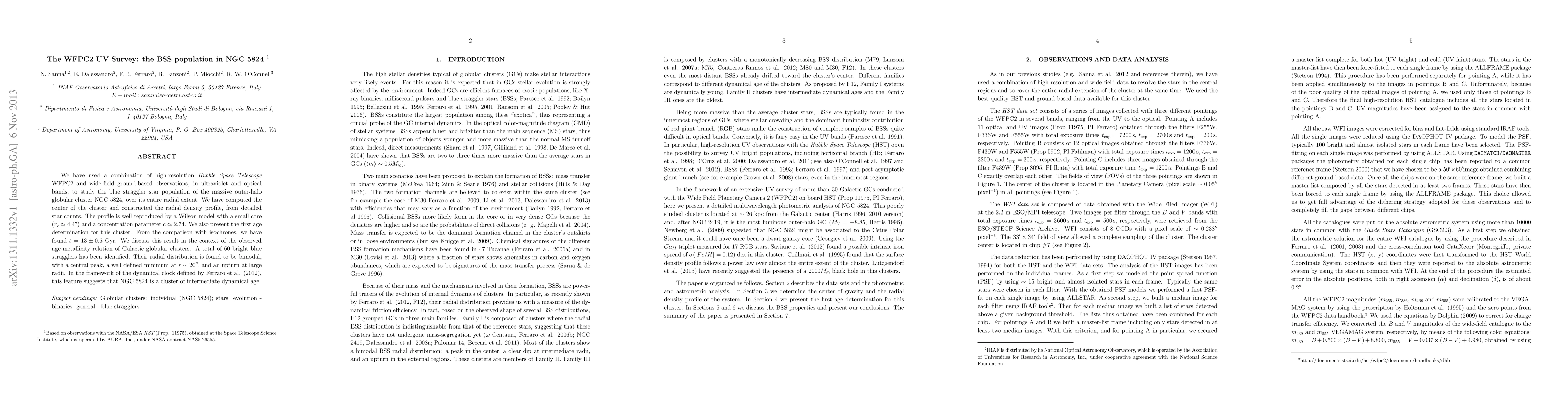 We have used a combination of high-resolution Hubble Space Telescope WFPC2 and wide-field ground-based observations, in ultraviolet and optical bands, to study the blue straggler star population of the massive outer-halo globular cluster NGC 5824, over its entire radial extent. We have computed the center of gravity of the cluster and constructed the radial density profile, from detailed star counts. The profile is well reproduced by a Wilson model with a small core (r_c \simeq 4.4 arcsec) and a concentration parameter c \simeq 2.74. We also present the first age determination for this cluster. From the comparison with isochrones, we have found t=13\pm0.5 Gyr. We discuss this result in the context of the observed age-metallicity relation of Galactic globular clusters. A total of 60 bright blue stragglers has been identified. Their radial distribution is found to be bimodal, with a central peak, a well defined minimum at r \sim 20 arcsec, and an upturn at large radii. In the framework of the dynamical clock defined by Ferraro et al. (2012), this feature suggests that NGC 5824 is a cluster of intermediate dynamical age.