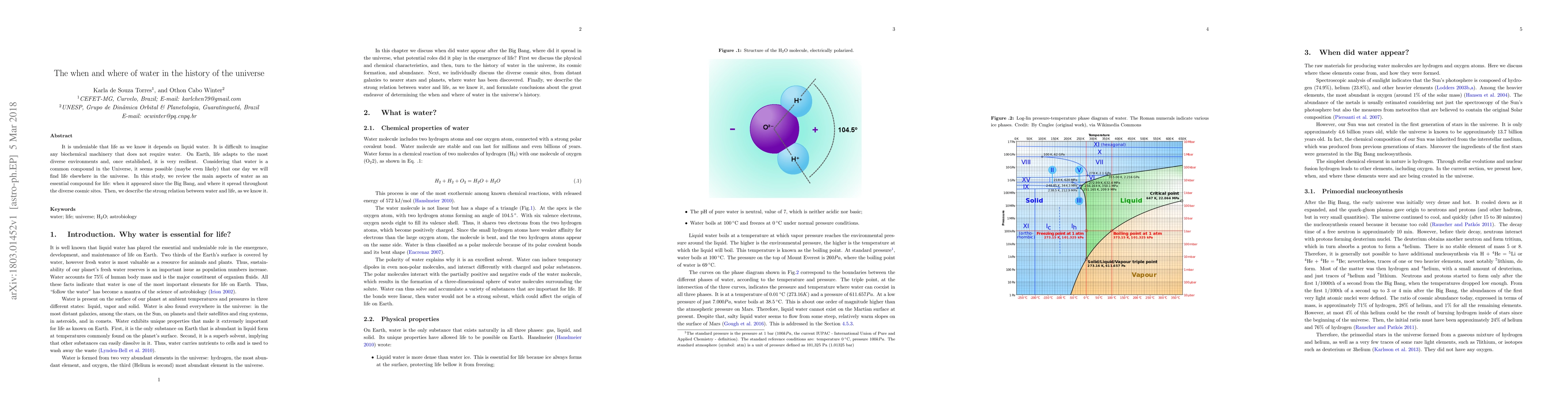 The paper reviews the origins of water in the universe, tracing its appearance since the Big Bang to its widespread presence in diverse cosmic environments. It explores the essential role of water in life as we know it, suggesting a possible connection between water and extraterrestrial life.