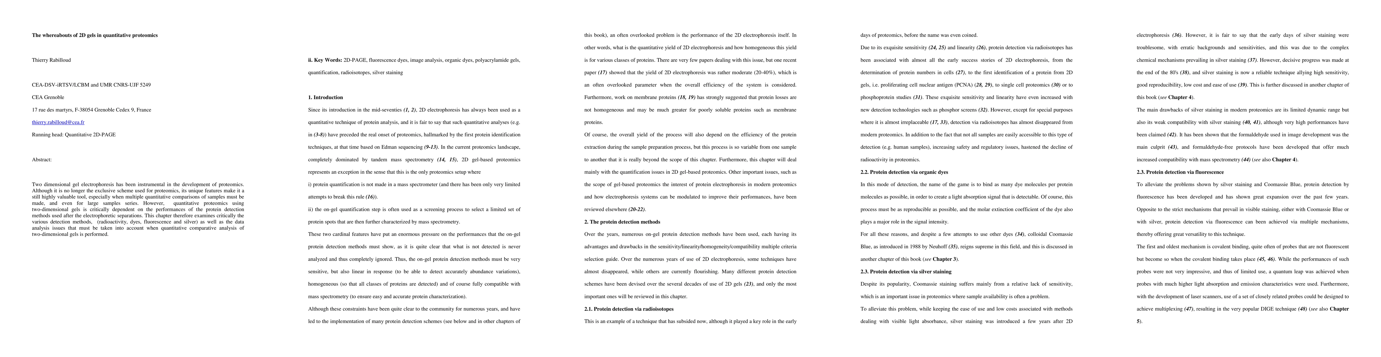 This paper reviews the continued relevance of 2D gel electrophoresis in quantitative proteomics, emphasizing its utility for multiple sample comparisons. It critically assesses various protein detection methods (radioactivity, dyes, fluorescence, and silver) and discusses data analysis challenges essential for accurate quantitative analysis.