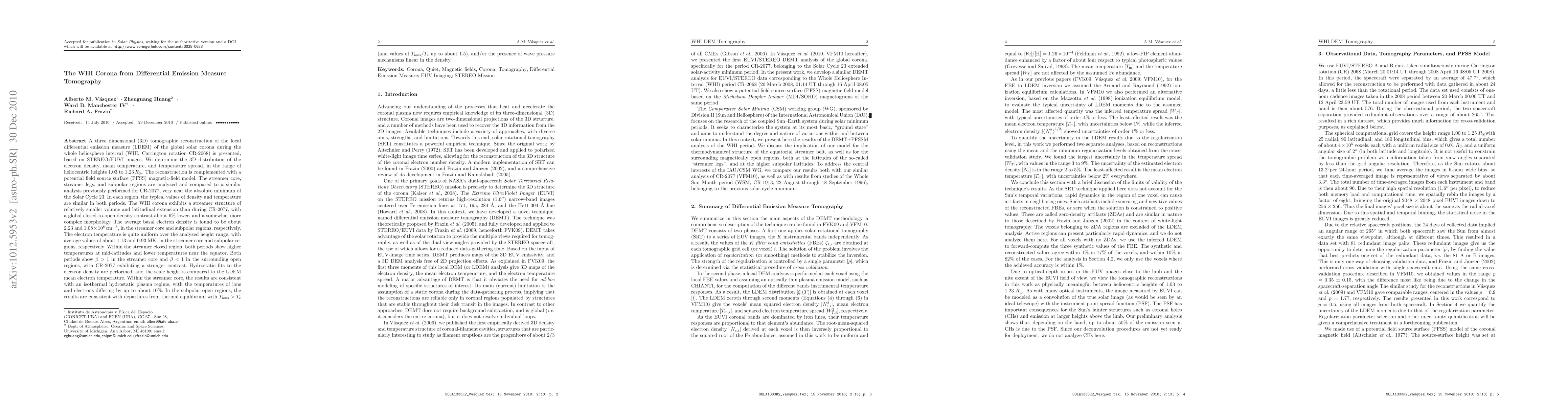 This paper presents a 3D tomographic reconstruction of the solar corona's differential emission measure during the whole heliosphere interval (WHI), revealing similar electron density and temperature values compared to the solar minimum of Cycle 23. The WHI corona shows a more complex structure with a lower density contrast and a smaller volume than previously observed.