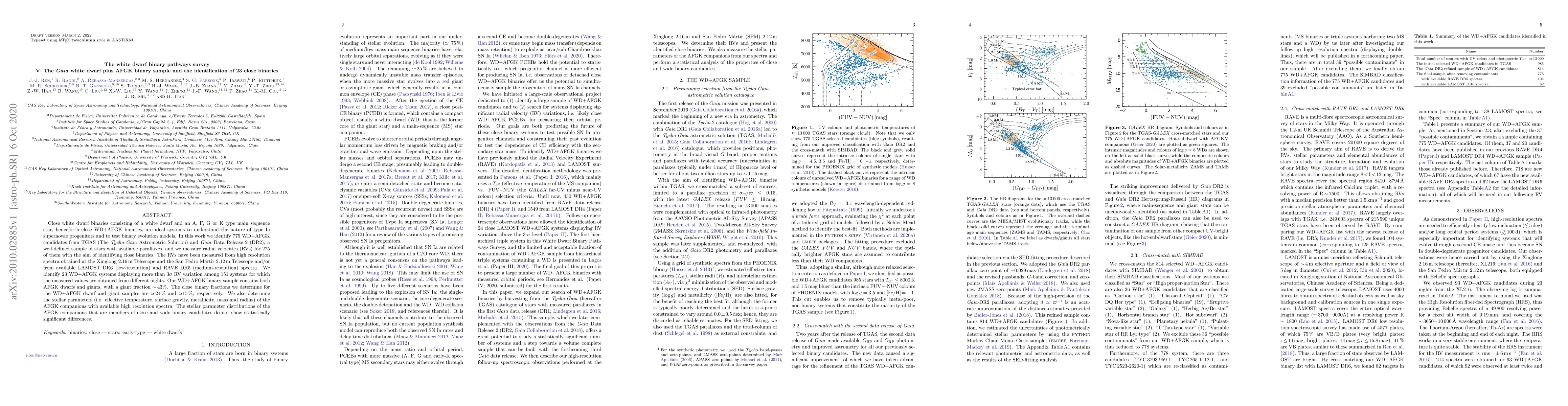 Close white dwarf binaries consisting of a white dwarf and an A, F, G or K type main sequence star, henceforth close WD+AFGK binaries, are ideal systems to understand the nature of type Ia supernovae progenitors and to test binary evolution models. In this work we identify 775 WD+AFGK candidates from TGAS (The Tycho-Gaia Astrometric Solution) and Gaia Data Release 2 (DR2), a well-defined sample of stars with available parallaxes, and we measure radial velocities (RVs) for 275 of them with the aim of identifying close binaries. The RVs have been measured from high resolution spectra obtained at the Xinglong 2.16m Telescope and the San Pedro M\'artir 2.12m Telescope and/or from available LAMOST DR6 (low-resolution) and RAVE DR5 (medium-resolution) spectra. We identify 23 WD+AFGK systems displaying more than 3$\sigma$ RV variation among 151 systems for which the measured values are obtained from different nights. Our WD+AFGK binary sample contains both AFGK dwarfs and giants, with a giant fraction $\sim$43%. The close binary fractions we determine for the WD+AFGK dwarf and giant samples are $\simeq$24% and $\simeq$15%, respectively. We also determine the stellar parameters (i.e. effective temperature, surface gravity, metallicity, mass and radius) of the AFGK companions with available high resolution spectra. The stellar parameter distributions of the AFGK companions that are members of close and wide binary candidates do not show statistically significant differences.
