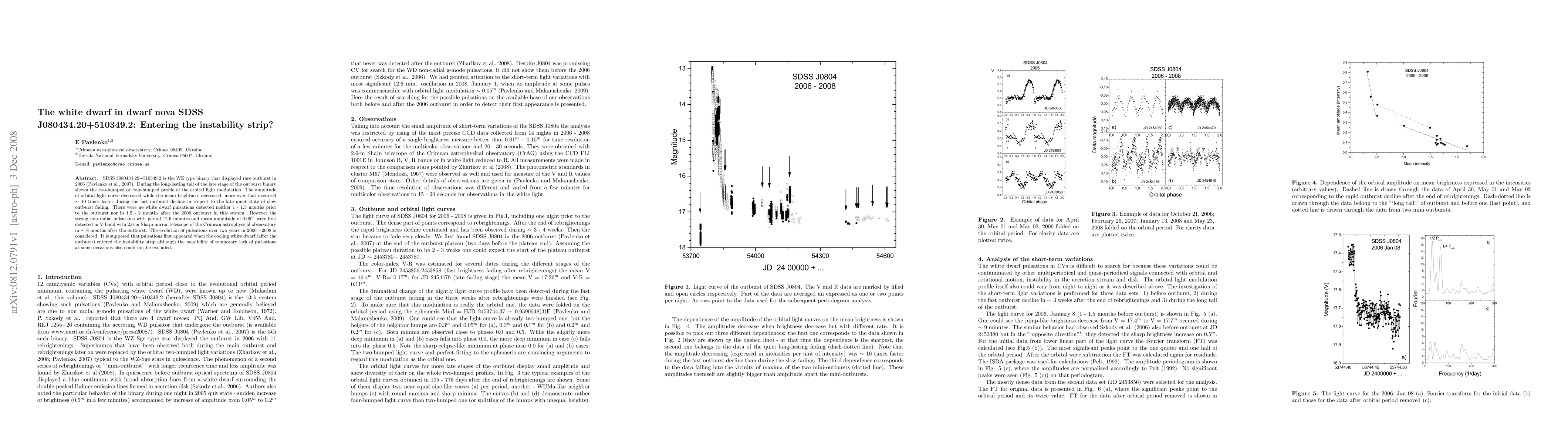 SDSS J080434.20+510349.2 is the WZ type binary that displayed rare outburst in 2006 (Pavlenko et al., 2007). During the long-lasting tail of the late stage of the outburst binary shown the two-humped or four-humped profile of the orbital light modulation. The amplitude of orbital light curve decreased while the mean brightness decreased, more over that occurred $\sim$ 10 times faster during the fast outburst decline in respect to the late quiet state of slow outburst fading. There were no white dwarf pulsations detected neither 1 - 1.5 months prior to the outburst nor in 1.5 - 2 months after the 2006 outburst in this system. However the strong non-radial pulsations with period 12.6 minutes and mean amplitude of 0.05^m were first detected in V band with 2.6-m Shajn mirror telescope of the Crimean astrophysical observatory in ~ 8 months after the outburst. The evolution of pulsations over two years in 2006 - 2008 is considered. It is supposed that pulsations first appeared when the cooling white dwarf (after the outburst) entered the instability strip although the possibility of temporary lack of pulsations at some occasions also could not be excluded.