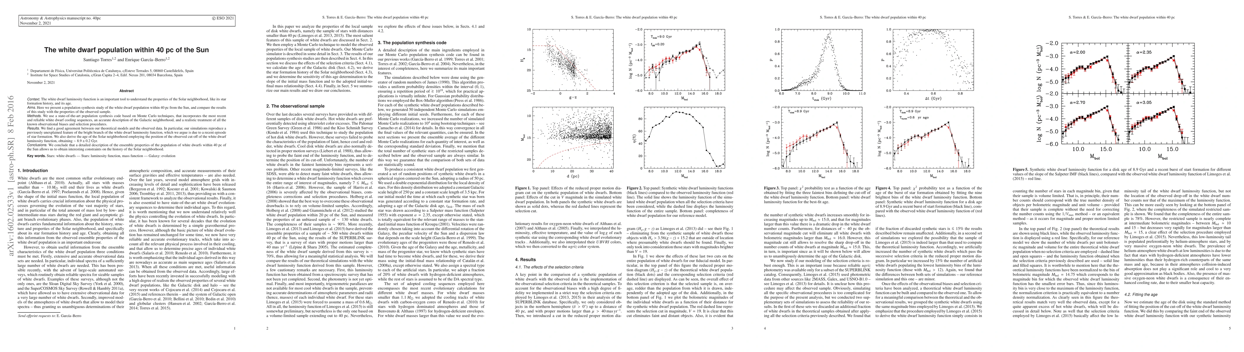 This study uses advanced population synthesis techniques to analyze the white dwarf population within 40 pc of the Sun, finding good agreement between theoretical models and observed data. The research reveals a recent star formation episode and estimates the Solar neighborhood's age at ~8.9±0.2 Gyr.