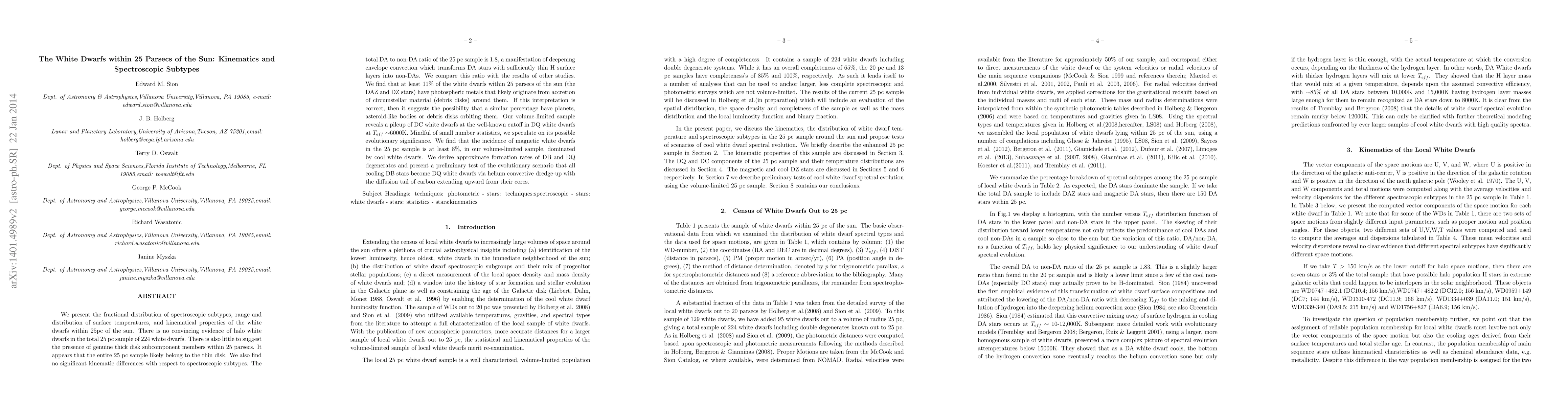 This paper analyzes the kinematics and spectroscopic subtypes of white dwarfs within 25 parsecs of the Sun, finding no evidence of halo or thick disk components. The study reveals a DA to non-DA ratio of 1.8, suggesting a transformation due to convection, and notes that at least 11% of these white dwarfs show evidence of metal accretion, potentially indicating the presence of orbiting bodies or debris disks.