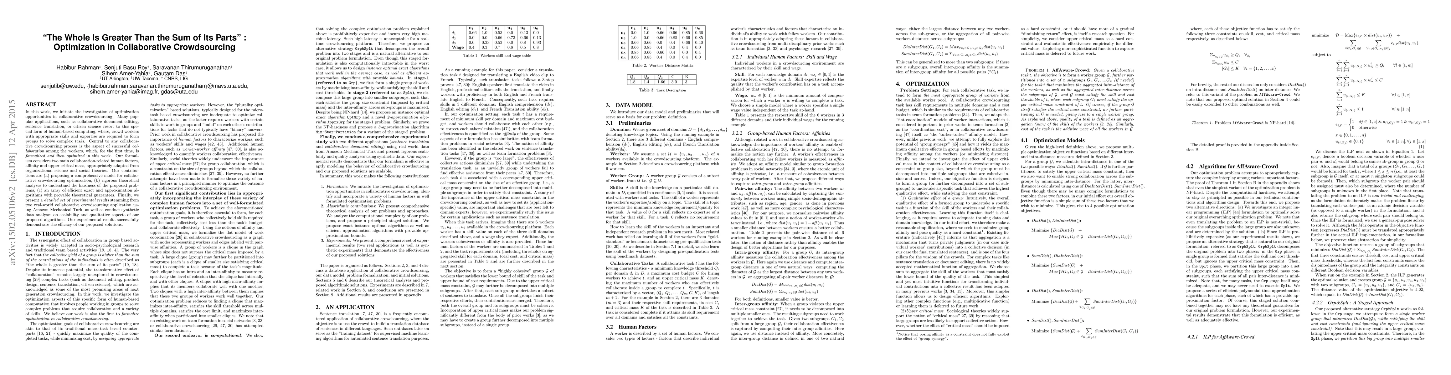This paper proposes a comprehensive model for optimizing collaborative crowdsourcing, focusing on successful worker collaboration through factors like affinity and upper critical mass. It presents theoretical analyses, efficient algorithms, and experimental results from real-world applications, demonstrating the effectiveness of the proposed optimization strategies.