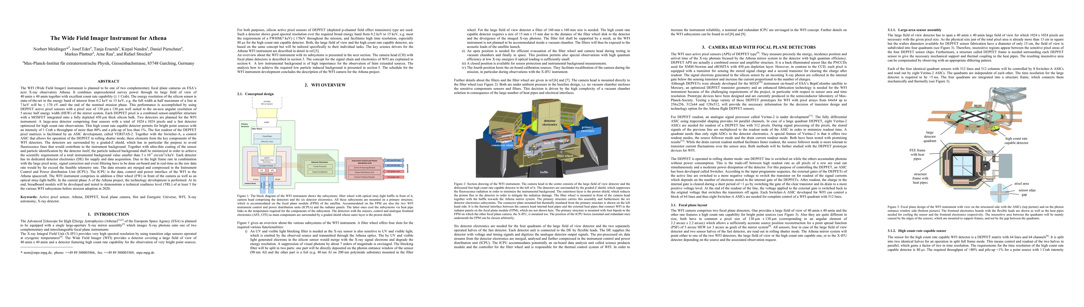 The WFI instrument for ESA's Athena X-ray observatory features two complementary cameras with a large 40 arcmin x 40 arcmin field of view and excellent count rate capability. It utilizes DEPFET active pixel sensors for state-of-the-art energy resolution from 0.2 keV to 15 keV, supported by VERITAS-2 ASIC and Switcher-A control ASIC for fast readout.