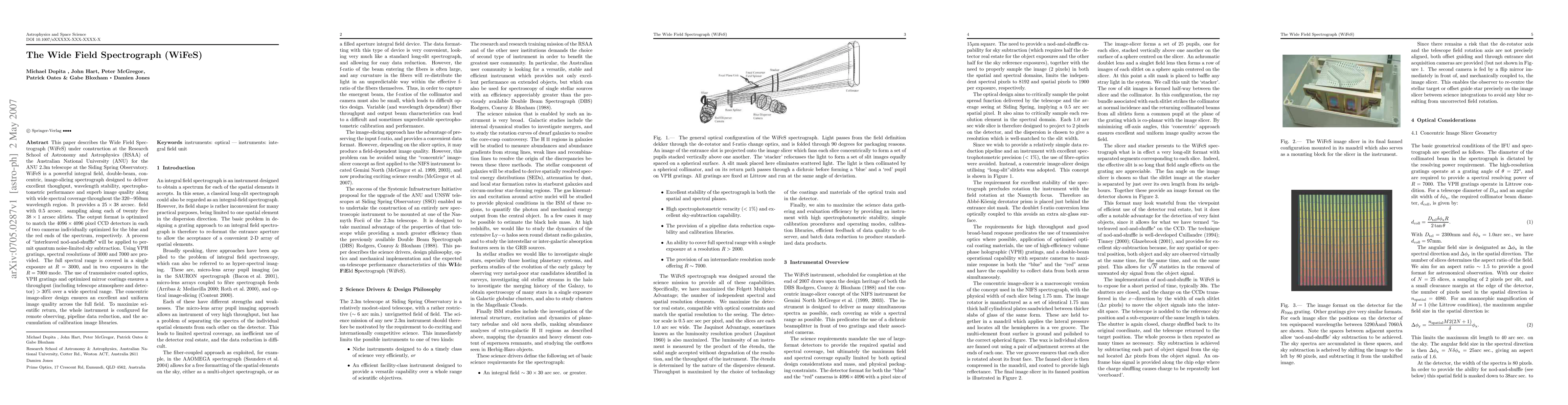 The Wide Field Spectrograph (WiFeS) is a new integral field spectrograph for the ANU 2.3m telescope, designed for high throughput and spectral resolution across 320-950 nm. It features a 25x38 arcsec field with 0.5 arcsec sampling and is optimized for remote observing and data reduction.