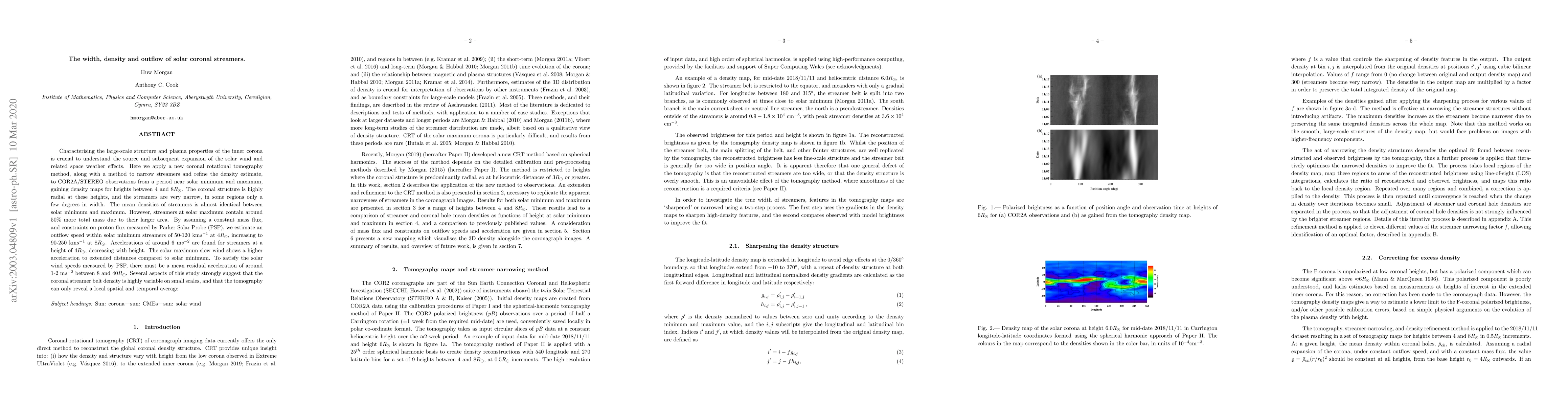 Characterising the large-scale structure and plasma properties of the inner corona is crucial to understand the source and subsequent expansion of the solar wind and related space weather effects. Here we apply a new coronal rotational tomography method, along with a method to narrow streamers and refine the density estimate, to COR2A/STEREO observations from a period near solar minimum and maximum, gaining density maps for heights between 4 and 8\Rs. The coronal structure is highly radial at these heights, and the streamers are very narrow, in some regions only a few degrees in width. The mean densities of streamers is almost identical between solar minimum and maximum. However, streamers at solar maximum contain around 50\%\ more total mass due to their larger area. By assuming a constant mass flux, and constraints on proton flux measured by Parker Solar Probe (PSP), we estimate an outflow speed within solar minimum streamers of 50-120\kms\ at 4\Rs, increasing to 90-250\kms\ at 8\Rs. Accelerations of around 6\mss\ are found for streamers at a height of 4\Rs, decreasing with height. The solar maximum slow wind shows a higher acceleration to extended distances compared to solar minimum. To satisfy the solar wind speeds measured by PSP, there must be a mean residual acceleration of around 1-2\mss\ between 8 and 40\Rs. Several aspects of this study strongly suggest that the coronal streamer belt density is highly variable on small scales, and that the tomography can only reveal a local spatial and temporal average.