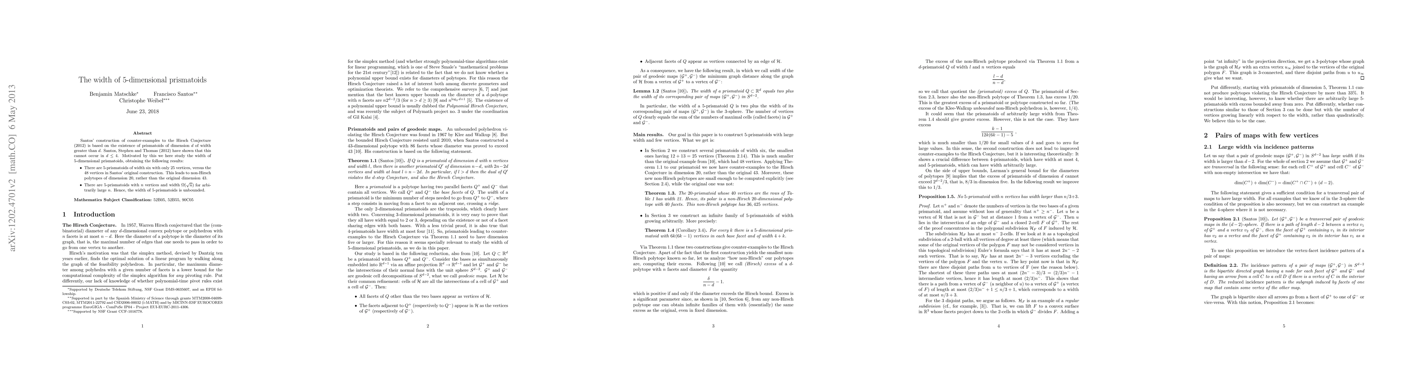 Santos' research reveals that 5-dimensional prismatoids can have a width greater than their dimension, providing counter-examples to the Hirsch Conjecture. Specifically, it identifies 5-prismatoids with width six using only 25 vertices, and demonstrates that the width can grow unboundedly with increasing vertex count.