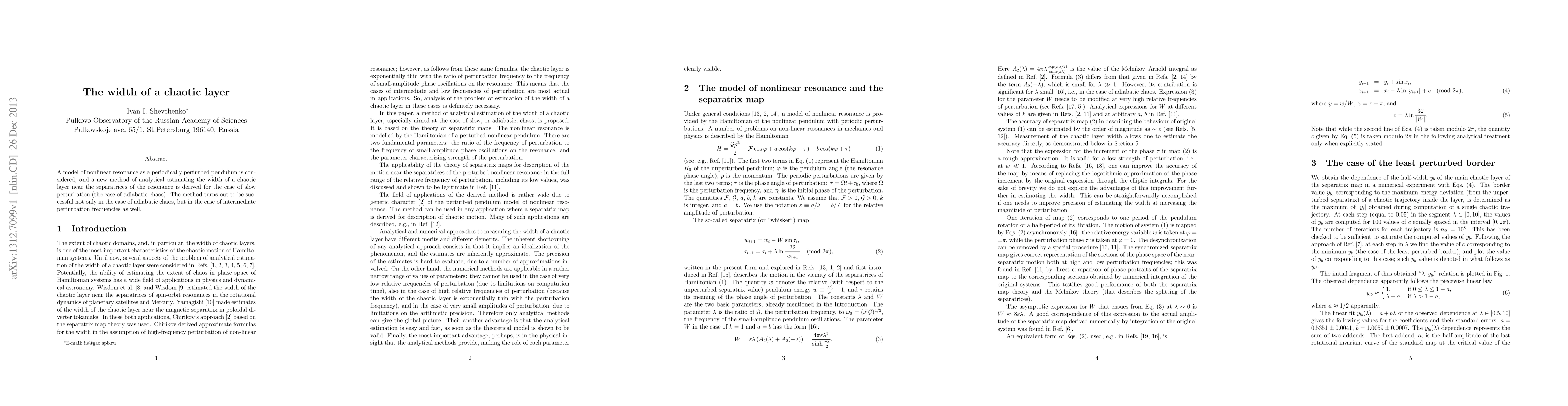 This paper develops a new analytical method to estimate the width of chaotic layers near the separatrices of a periodically perturbed nonlinear pendulum, showing success across both slow and intermediate perturbation frequencies. The method is particularly effective for understanding adiabatic chaos.
