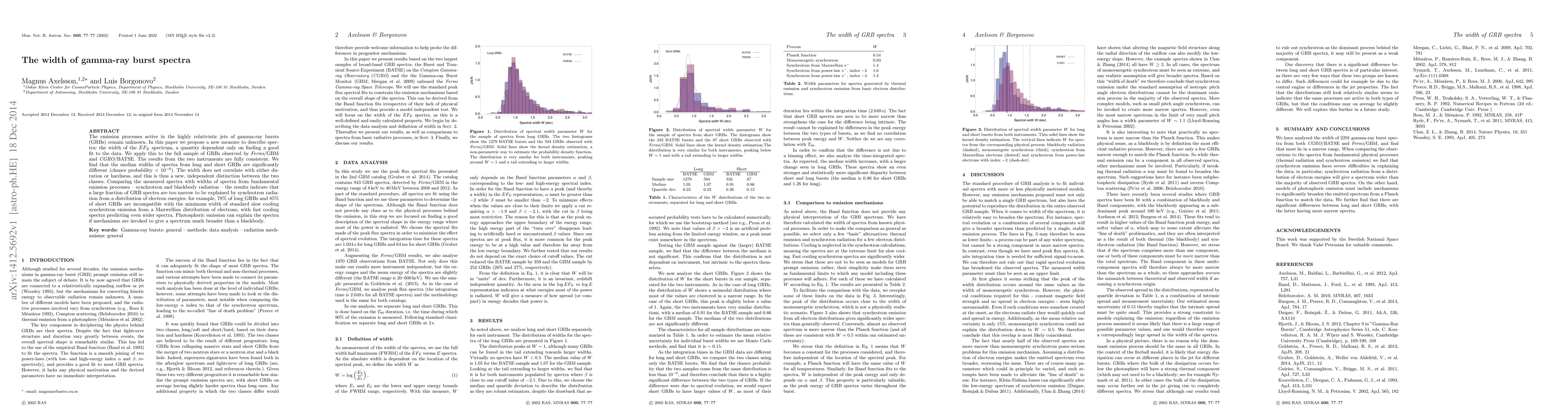 The emission processes active in the highly relativistic jets of gamma-ray bursts (GRBs) remain unknown. In this paper we propose a new measure to describe spectra: the width of the $EF_E$ spectrum, a quantity dependent only on finding a good fit to the data. We apply this to the full sample of GRBs observed by Fermi/GBM and CGRO/BATSE. The results from the two instruments are fully consistent. We find that the median widths of spectra from long and short GRBs are significantly different (chance probability $<10^{-6}$). The width does not correlate with either duration or hardness, and this is thus a new, independent distinction between the two classes. Comparing the measured spectra with widths of spectra from fundamental emission processes -- synchrotron and blackbody radiation -- the results indicate that a large fraction of GRB spectra are too narrow to be explained by synchrotron radiation from a distribution of electron energies: for example, 78% of long GRBs and 85% of short GRBs are incompatible with the minimum width of standard slow cooling synchrotron emission from a Maxwellian distribution of electrons, with fast cooling spectra predicting even wider spectra. Photospheric emission can explain the spectra if mechanisms are invoked to give a spectrum much broader than a blackbody.