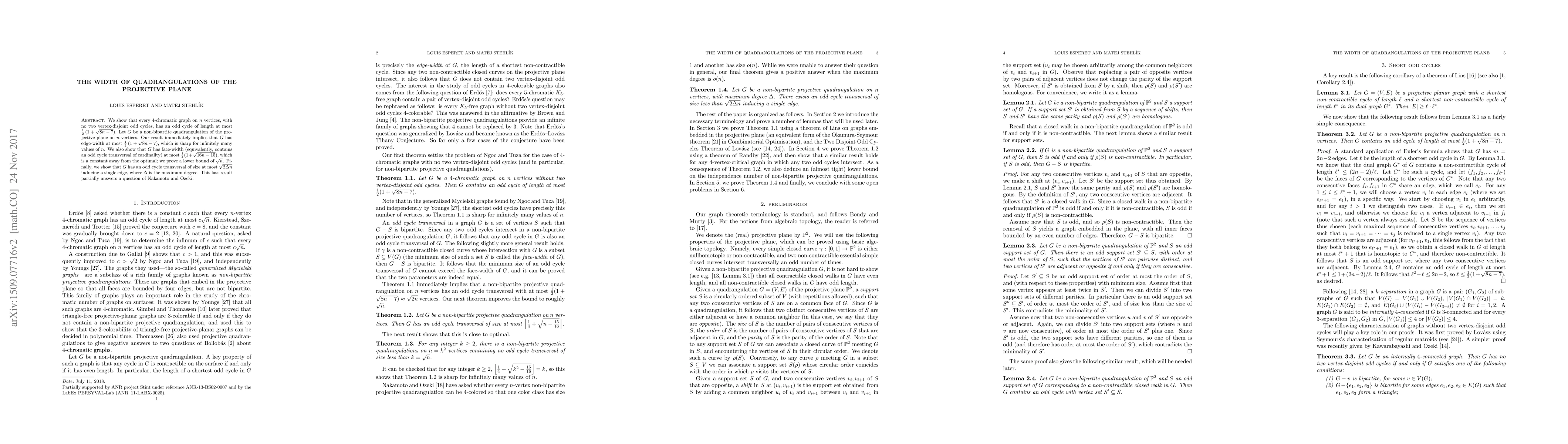 We show that every $4$-chromatic graph on $n$ vertices, with no two vertex-disjoint odd cycles, has an odd cycle of length at most $\tfrac12\,(1+\sqrt{8n-7})$. Let $G$ be a non-bipartite quadrangulation of the projective plane on $n$ vertices. Our result immediately implies that $G$ has edge-width at most $\tfrac12\,(1+\sqrt{8n-7})$, which is sharp for infinitely many values of $n$. We also show that $G$ has face-width (equivalently, contains an odd cycle transversal of cardinality) at most $\tfrac14(1+\sqrt{16 n-15})$, which is a constant away from the optimal; we prove a lower bound of $\sqrt{n}$. Finally, we show that $G$ has an odd cycle transversal of size at most $\sqrt{2\Delta n}$ inducing a single edge, where $\Delta$ is the maximum degree. This last result partially answers a question of Nakamoto and Ozeki.