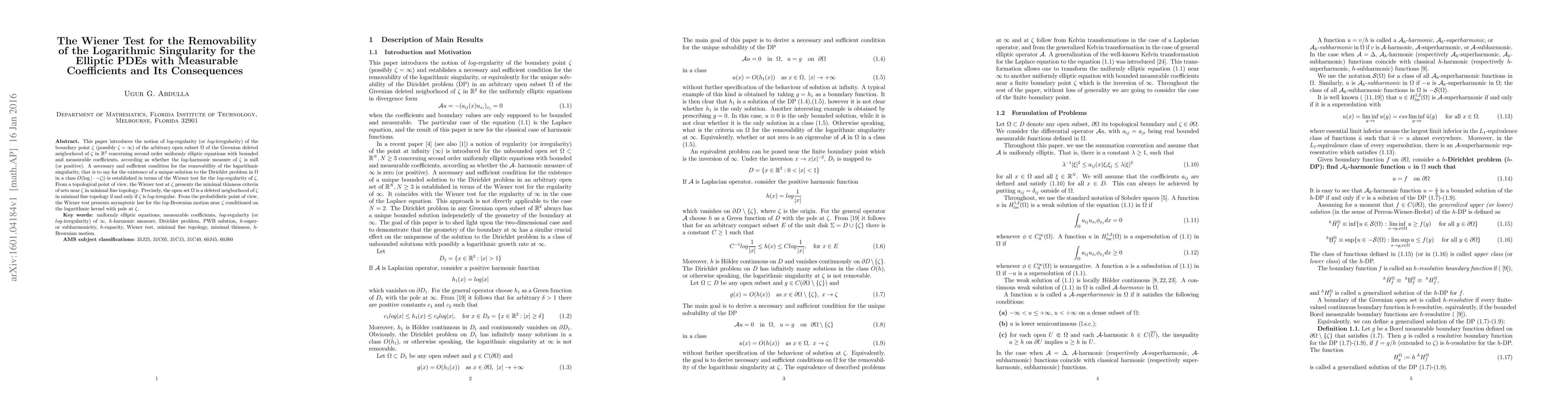 This paper establishes a necessary and sufficient condition for the removability of logarithmic singularities in elliptic PDEs with measurable coefficients using the Wiener test, which characterizes the $log$-regularity of boundary points. It also connects the Wiener test to minimal thinness criteria and the asymptotic behavior of log-Brownian motion.