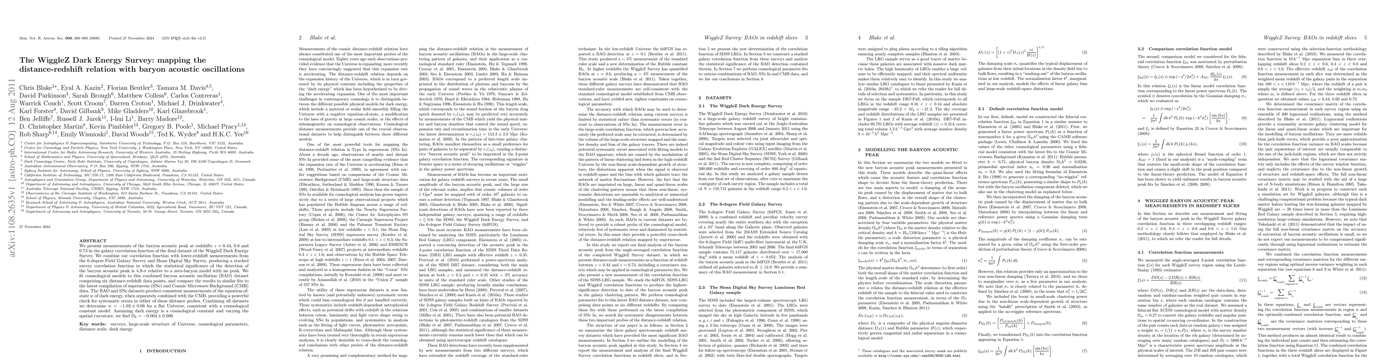 The WiggleZ Dark Energy Survey measures baryon acoustic oscillations at redshifts z = 0.44, 0.6, and 0.73, detecting a 4.9-sigma peak in the galaxy correlation function. Combined with other surveys, this data supports a dark energy equation-of-state w = -1.03 +/- 0.08, consistent with a cosmological constant model.