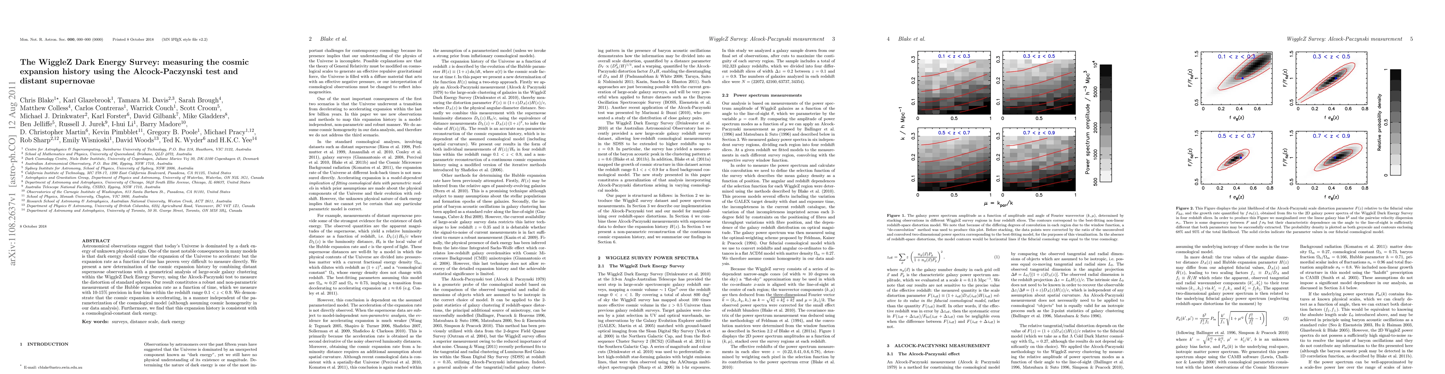 The WiggleZ Dark Energy Survey combines supernovae observations and large-scale galaxy clustering to measure the cosmic expansion history using the Alcock-Paczynski test, confirming accelerating expansion consistent with a cosmological-constant dark energy model. The study provides a robust, non-parametric measurement of the Hubble expansion rate with 10-15% precision across four redshift bins.