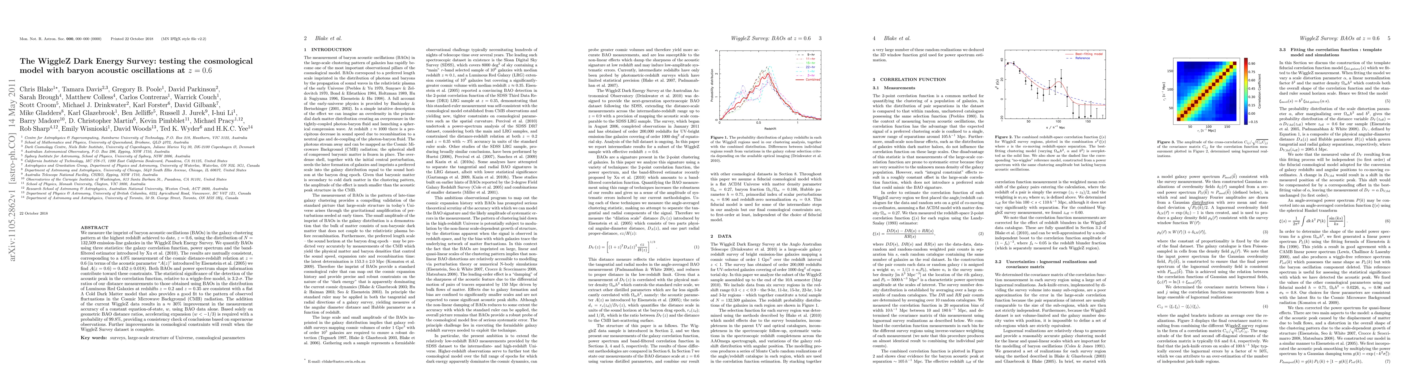The WiggleZ Dark Energy Survey measures baryon acoustic oscillations (BAOs) in galaxy clustering at z=0.6, achieving a 4.0% accuracy in the cosmic distance-redshift relation, supporting a flat Lambda Cold Dark Matter model and indicating accelerating expansion with 99.8% probability. The survey's data significantly improves constraints on the equation-of-state parameter, w.