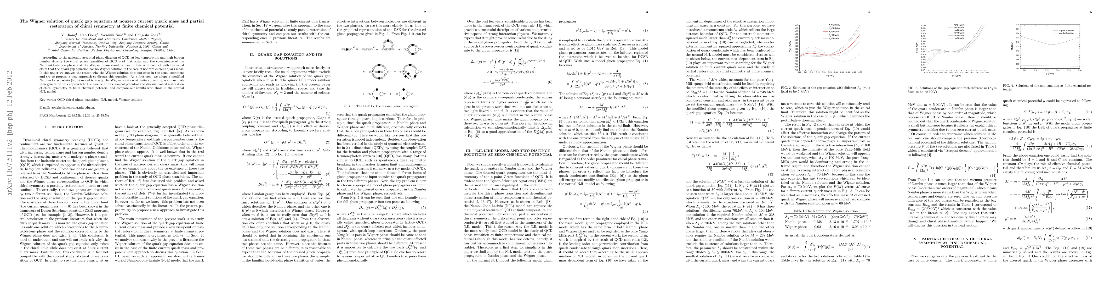 According to the generally accepted phase diagram of QCD, at low temperature and high baryon number density the chiral phase transition of QCD is of first order and the co-existence of the Nambu-Goldstone phase and the Wigner phase should appear. This is in conflict with the usual claim that the quark gap equation has no Wigner solution in the case of nonzero current quark mass. In this paper we analyze the reason why the Wigner solution does not exist in the usual treatment and try to propose a new approach to discuss this question. As a first step, we adopt a modified Nambu-Jona-Lasinio (NJL) model to study the Wigner solution at finite current quark mass. We then generalize this approach to the case of finite chemical potential and discuss partial restoration of chiral symmetry at finite chemical potential and compare our results with those in the normal NJL model.