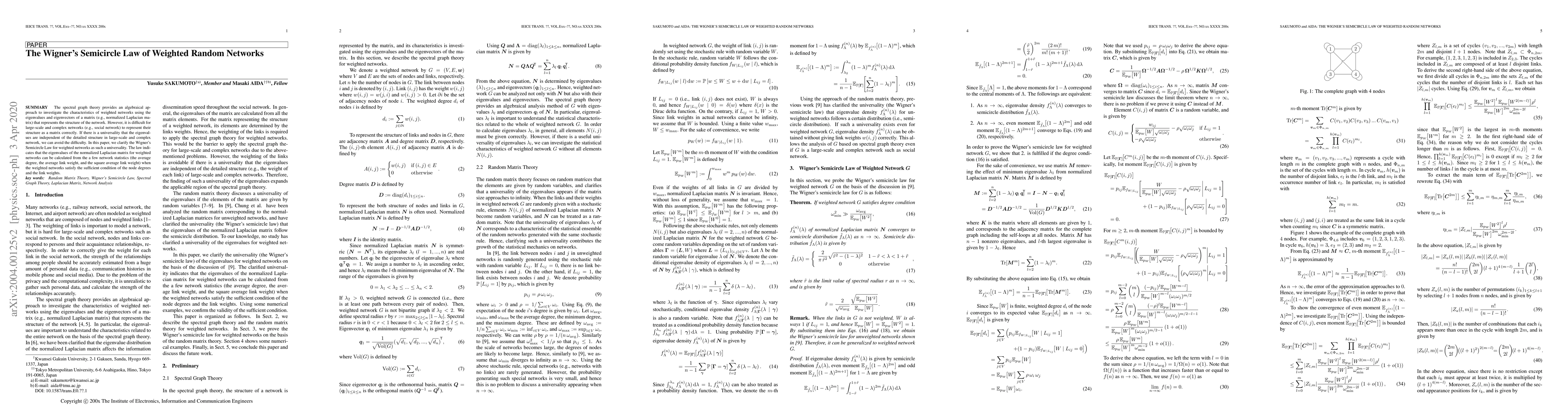 The spectral graph theory provides an algebraical approach to investigate the characteristics of weighted networks using the eigenvalues and eigenvectors of a matrix (e.g., normalized Laplacian matrix) that represents the structure of the network. However, it is difficult for large-scale and complex networks (e.g., social network) to represent their structure as a matrix correctly. If there is a universality that the eigenvalues are independent of the detailed structure in large-scale and complex network, we can avoid the difficulty. In this paper, we clarify the Wigner's Semicircle Law for weighted networks as such a universality. The law indicates that the eigenvalues of the normalized Laplacian matrix for weighted networks can be calculated from the a few network statistics (the average degree, the average link weight, and the square average link weight) when the weighted networks satisfy the sufficient condition of the node degrees and the link weights.