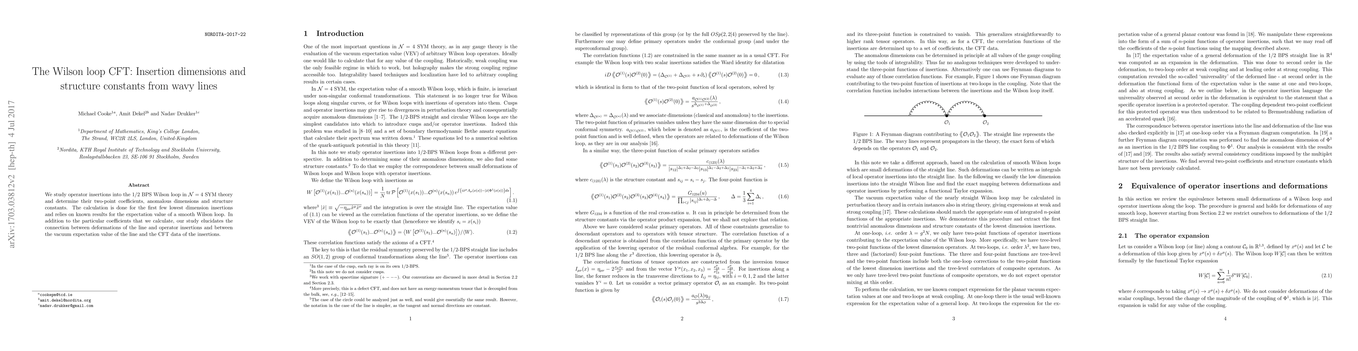 This paper investigates operator insertions into the $1/2$ BPS Wilson loop in ${\cal N}=4$ SYM theory, determining their two-point coefficients, anomalous dimensions, and structure constants for the lowest dimension insertions, using known results for the smooth Wilson loop. The study also reveals the link between line deformations, operator insertions, and CFT data.