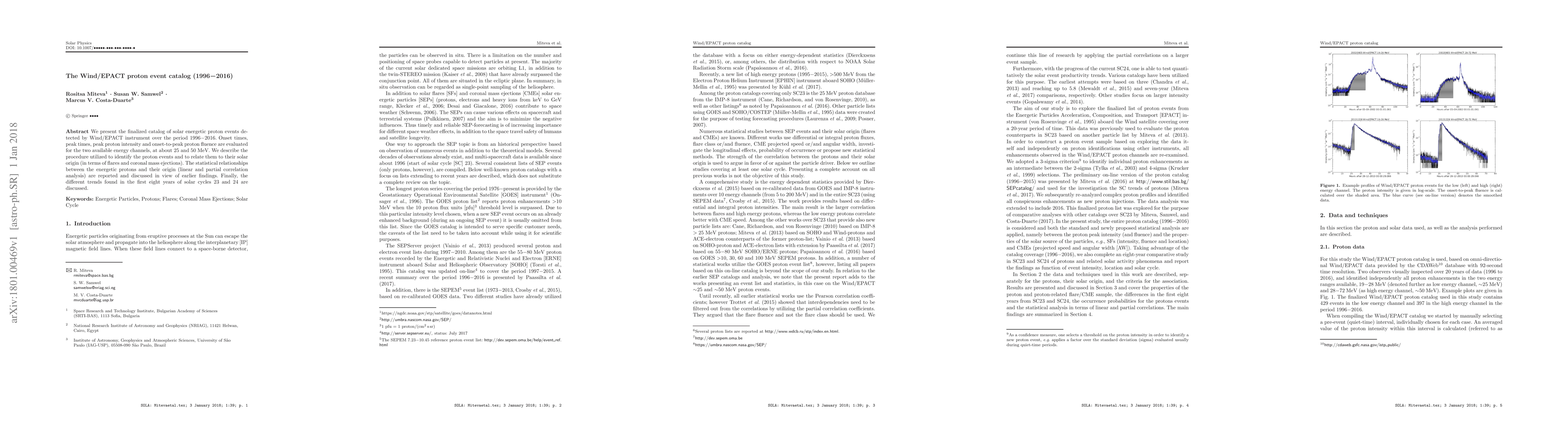 We present the finalized catalog of solar energetic proton events detected by Wind/EPACT instrument over the period 1996-2016. Onset times, peak times, peak proton intensity and onset-to-peak proton fluence are evaluated for the two available energy channels, at about 25 and 50 MeV. We describe the procedure utilized to identify the proton events and to relate them to their solar origin (in terms of flares and coronal mass ejections). The statistical relationships between the energetic protons and their origin (linear and partial correlation analysis) are reported and discussed in view of earlier findings. Finally, the different trends found in the first eight years of solar cycles 23 and 24 are discussed.