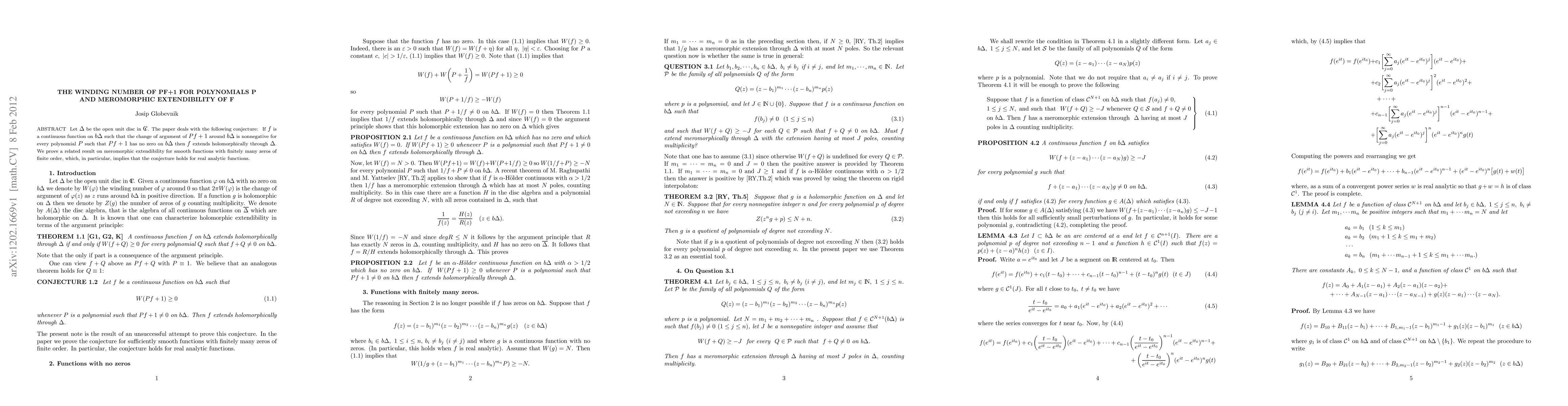 The paper proves a related result on meromorphic extendibility for smooth functions with finitely many zeros of finite order, which implies the conjecture that a continuous function extending holomorphically through the open unit disc if the change of argument of its derivative is nonnegative around the boundary.