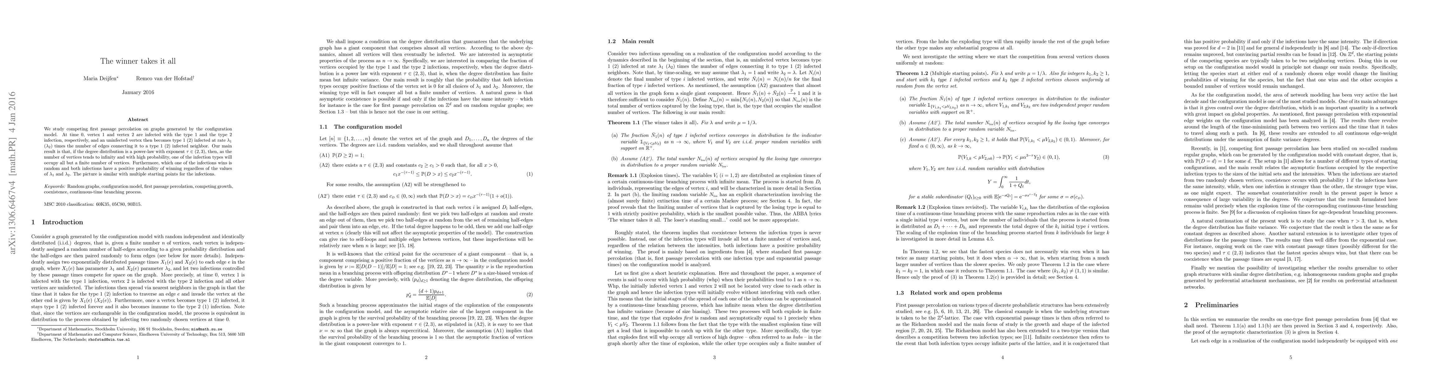 This paper investigates competing first passage percolation on graphs with a power-law degree distribution. It finds that, with high probability, one infection type will dominate almost all vertices, while the winning type is determined randomly, with both types having a positive chance of winning.