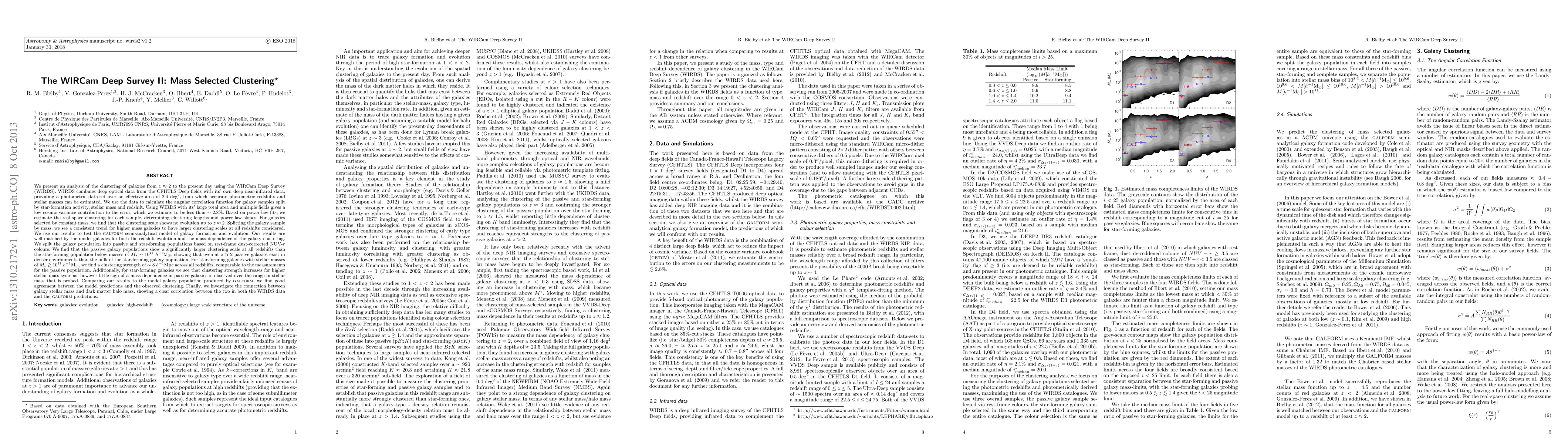This study analyzes the clustering of galaxies from z ~ 2 to the present using the WIRCam Deep Survey, finding that higher mass galaxies exhibit larger clustering scales, and passive galaxies occupy denser environments than star-forming ones, especially below $10^{11}M_\odot/h$. The results align with the GALFORM model and show a correlation between galaxy stellar mass and dark matter halo mass.
