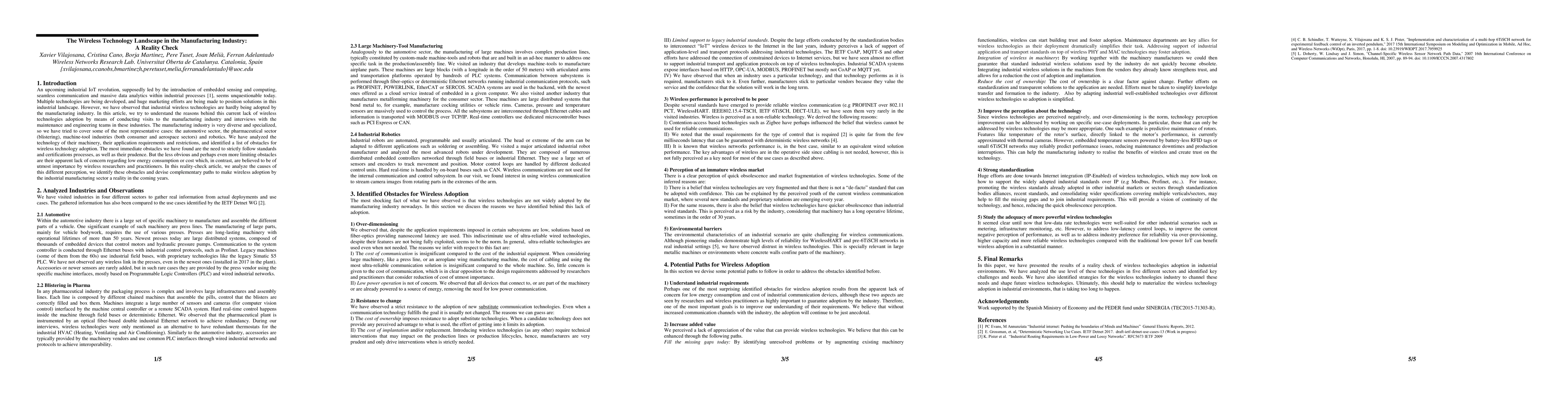 The manufacturing industry is slow to adopt wireless technologies due to a lack of concern for low energy consumption and cost, as well as strict standards and certification processes.