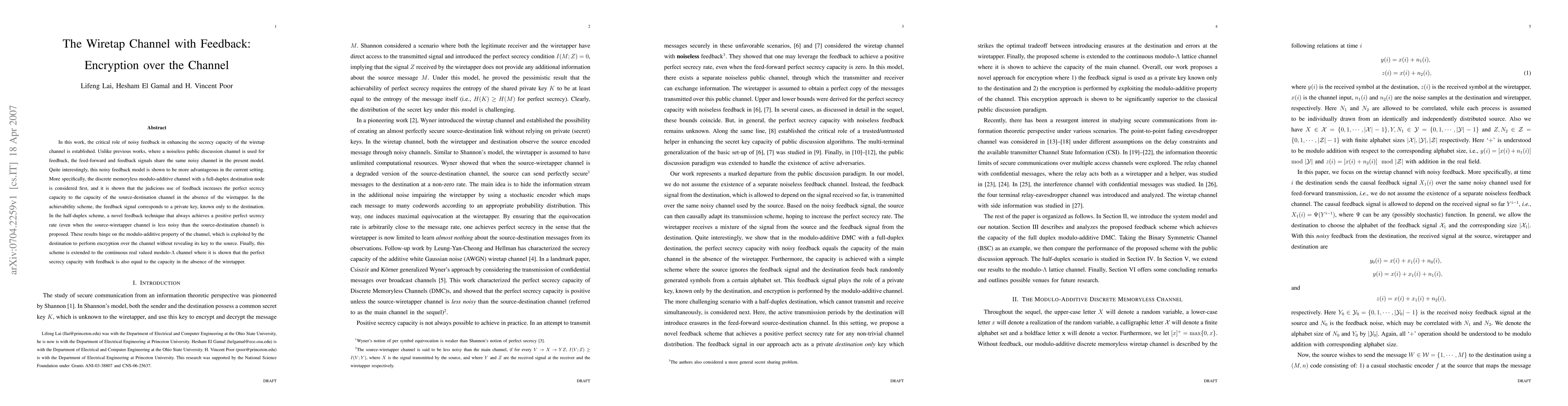 In this work, the critical role of noisy feedback in enhancing the secrecy capacity of the wiretap channel is established. Unlike previous works, where a noiseless public discussion channel is used for feedback, the feed-forward and feedback signals share the same noisy channel in the present model. Quite interestingly, this noisy feedback model is shown to be more advantageous in the current setting. More specifically, the discrete memoryless modulo-additive channel with a full-duplex destination node is considered first, and it is shown that the judicious use of feedback increases the perfect secrecy capacity to the capacity of the source-destination channel in the absence of the wiretapper. In the achievability scheme, the feedback signal corresponds to a private key, known only to the destination. In the half-duplex scheme, a novel feedback technique that always achieves a positive perfect secrecy rate (even when the source-wiretapper channel is less noisy than the source-destination channel) is proposed. These results hinge on the modulo-additive property of the channel, which is exploited by the destination to perform encryption over the channel without revealing its key to the source. Finally, this scheme is extended to the continuous real valued modulo-$\Lambda$ channel where it is shown that the perfect secrecy capacity with feedback is also equal to the capacity in the absence of the wiretapper.