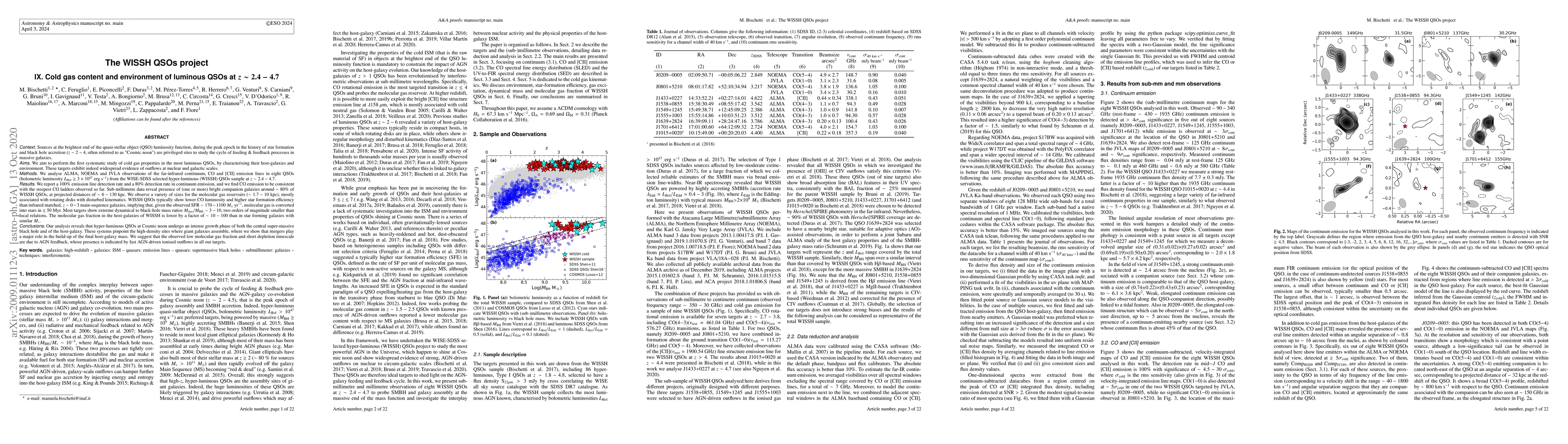 Sources at the brightest end of QSO luminosity function during the peak epoch of star formation and black hole accretion (z~2-4, i.e. Cosmic noon) are privileged sites to study the feeding & feedback cycle of massive galaxies. We perform the first systematic study of cold gas properties in the most luminous QSOs, by characterising their host-galaxies and environment. We analyse ALMA, NOEMA and JVLA observations of FIR continuum, CO and [CII] emission lines in eight QSOs ($L_{\rm Bol}>3\times10^{47}$ erg/s) from the WISSH sample at z~2.4-4.7. We report a 100% emission line detection rate and a 80% detection rate in continuum emission, and we find CO emission to be consistent with the steepest CO ladders observed so far. Sub-mm data reveal presence of (one or more) bright companion galaxies around 80% of WISSH QSOs, at projected distances of 6-130 kpc. We observe a variety of sizes for the molecular gas reservoirs (1.7-10 kpc), associated with rotating disks with disturbed kinematics. WISSH QSOs typically show lower CO luminosity and higher star formation efficiency than FIR matched, z~0-3 main-sequence galaxies, implying that, given the observed SFR ~170-1100 $M_\odot$/yr, molecular gas is converted into stars on <50 Myr. Most targets show extreme dynamical to black-hole mass ratios $M_{\rm dyn}/M_{\rm BH}\sim3-10$, two orders of magnitude smaller than local relations. The molecular gas fraction in WISSH hosts is lower by a factor of ~10-100 than in star forming galaxies with similar $M_*$. WISSH QSOs undergo an intense growth phase of both the central SMBH and host-galaxy. They pinpoint high-density sites where giant galaxies assemble and mergers play a major role in the build-up of the final host-galaxy mass. The observed low molecular gas fraction and short depletion timescale are likely due to AGN feedback, as traced by fast AGN-driven ionised outflows in all our targets.