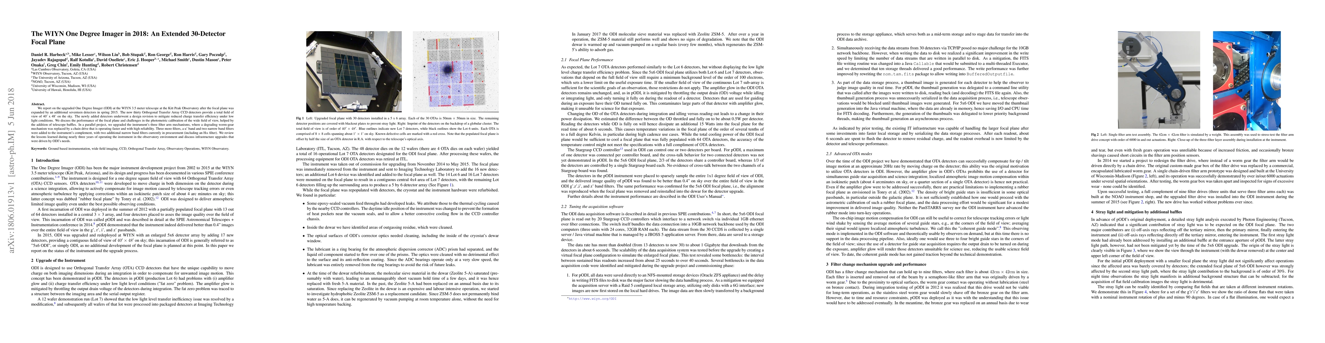 The WIYN One Degree Imager underwent upgrades in 2018, including a new 30-detector focal plane that expanded its field of view to 40' x 48', and improvements to the instrument's filter arm mechanisms and photometric calibration.